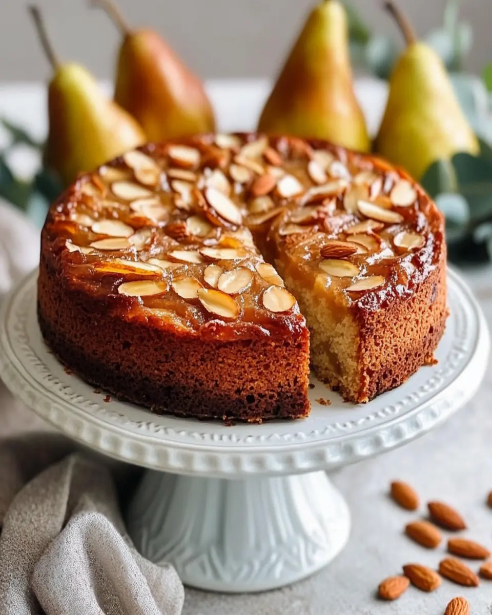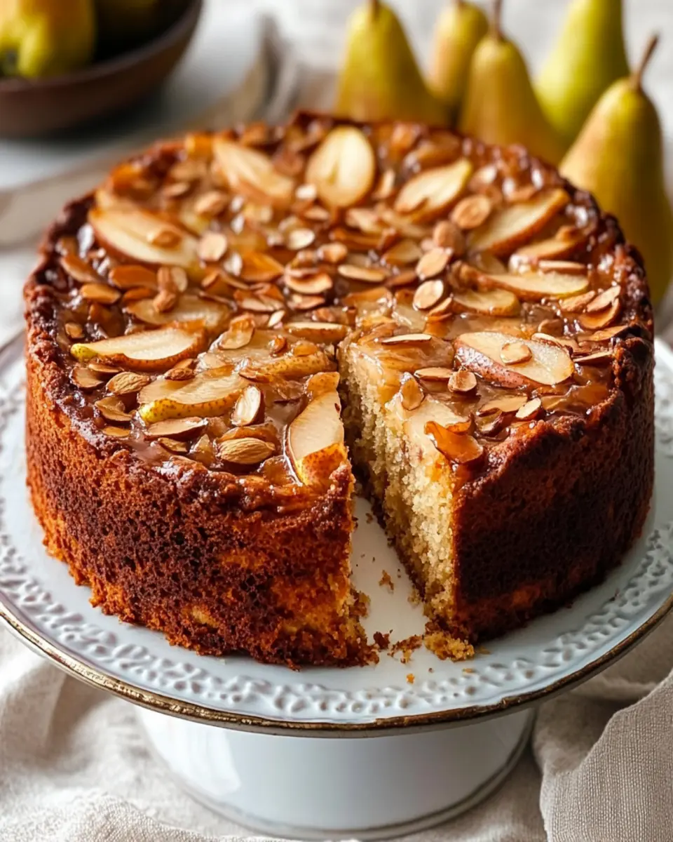 What sets this cake apart is its moist texture, which is achieved through the incorporation of fresh diced pears. Each bite offers a burst of natural sweetness that perfectly complements the nutty crunch of sliced almonds. It’s a cake that feels indulgent yet light, making it a fantastic choice for any occasion.