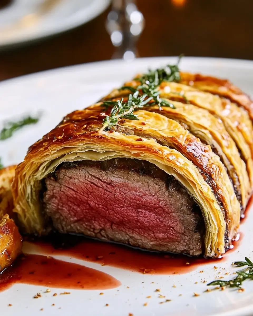 When serving Beef Wellington, presentation matters. Slice the Wellington into thick, even pieces to showcase the beautiful layers of beef, pâté, and mushrooms. Arrange the slices on a warm platter and drizzle with your chosen sauce. Garnish with fresh herbs, like parsley or thyme, for a pop of color that enhances the dish’s visual appeal.