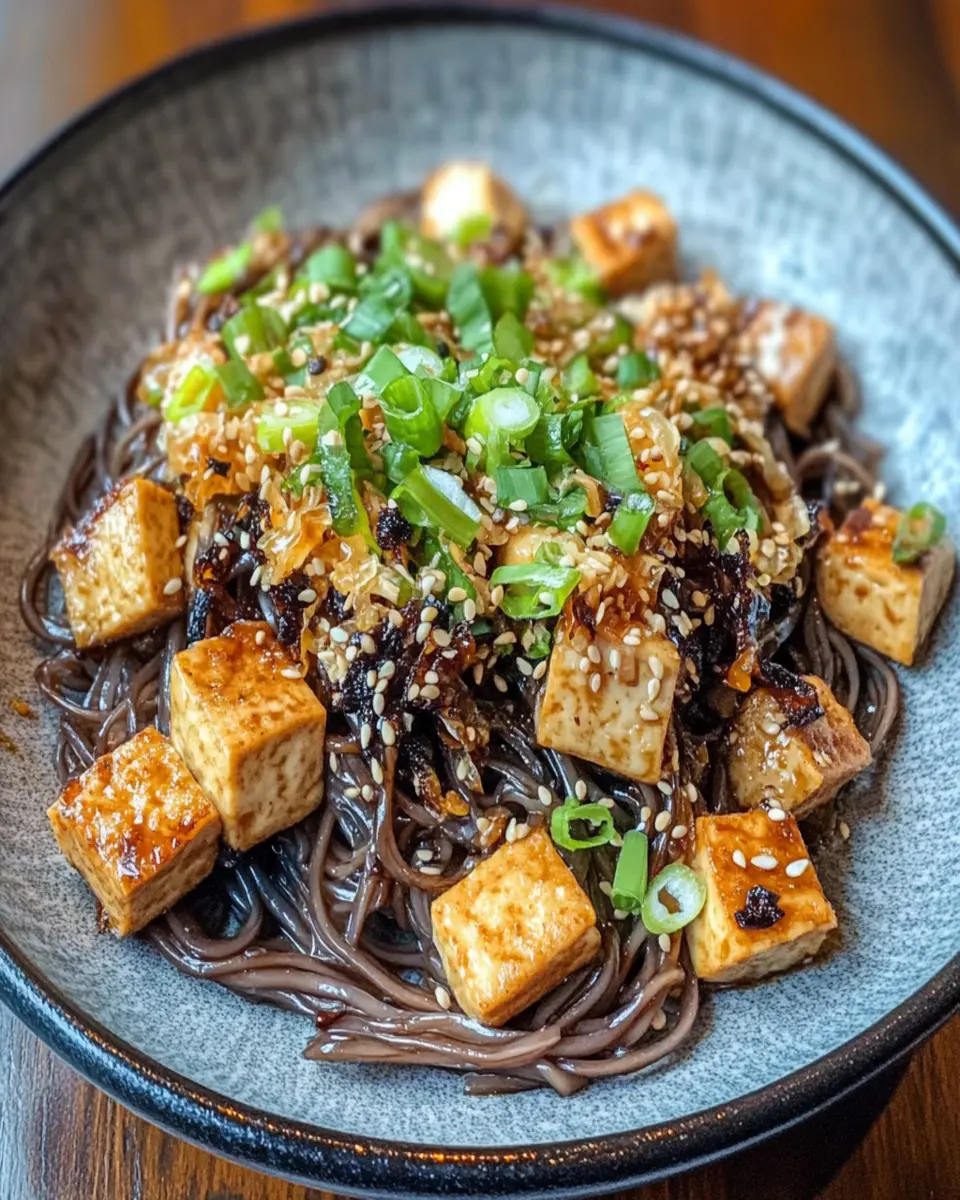 A delicious and flavorful dish combining black garlic miso noodles with crispy tofu, perfect for a satisfying meal.