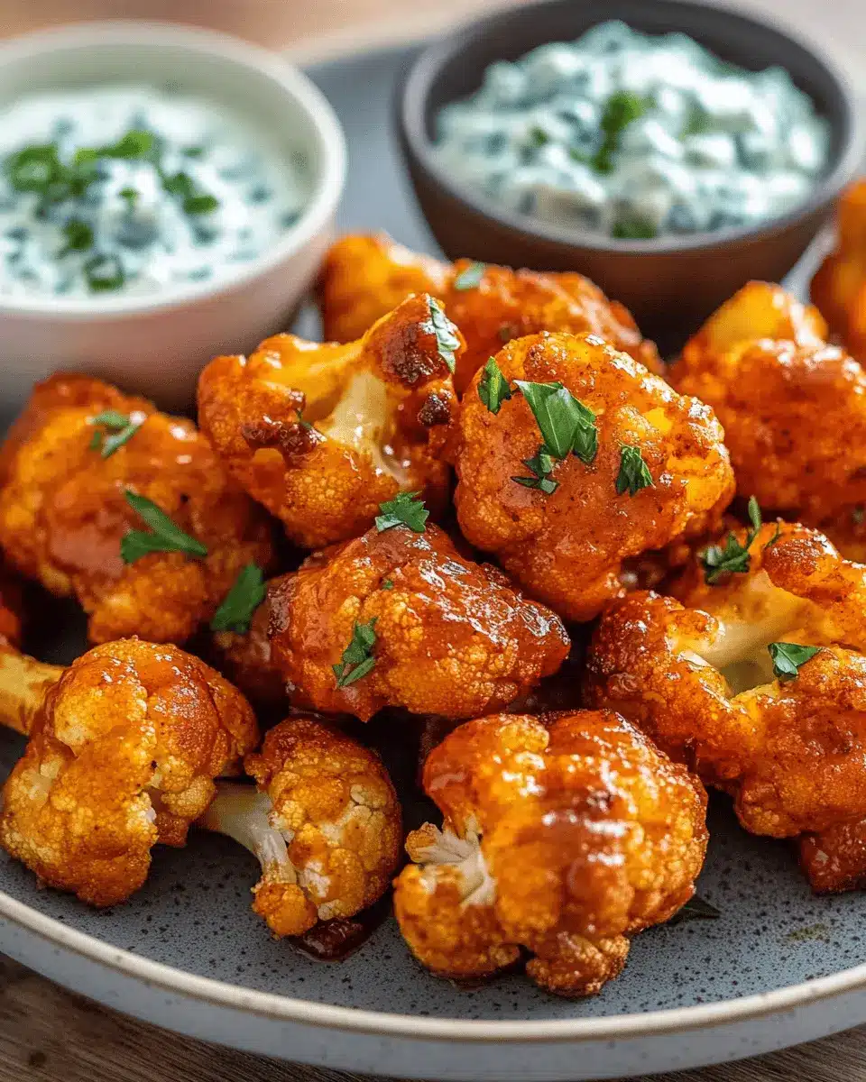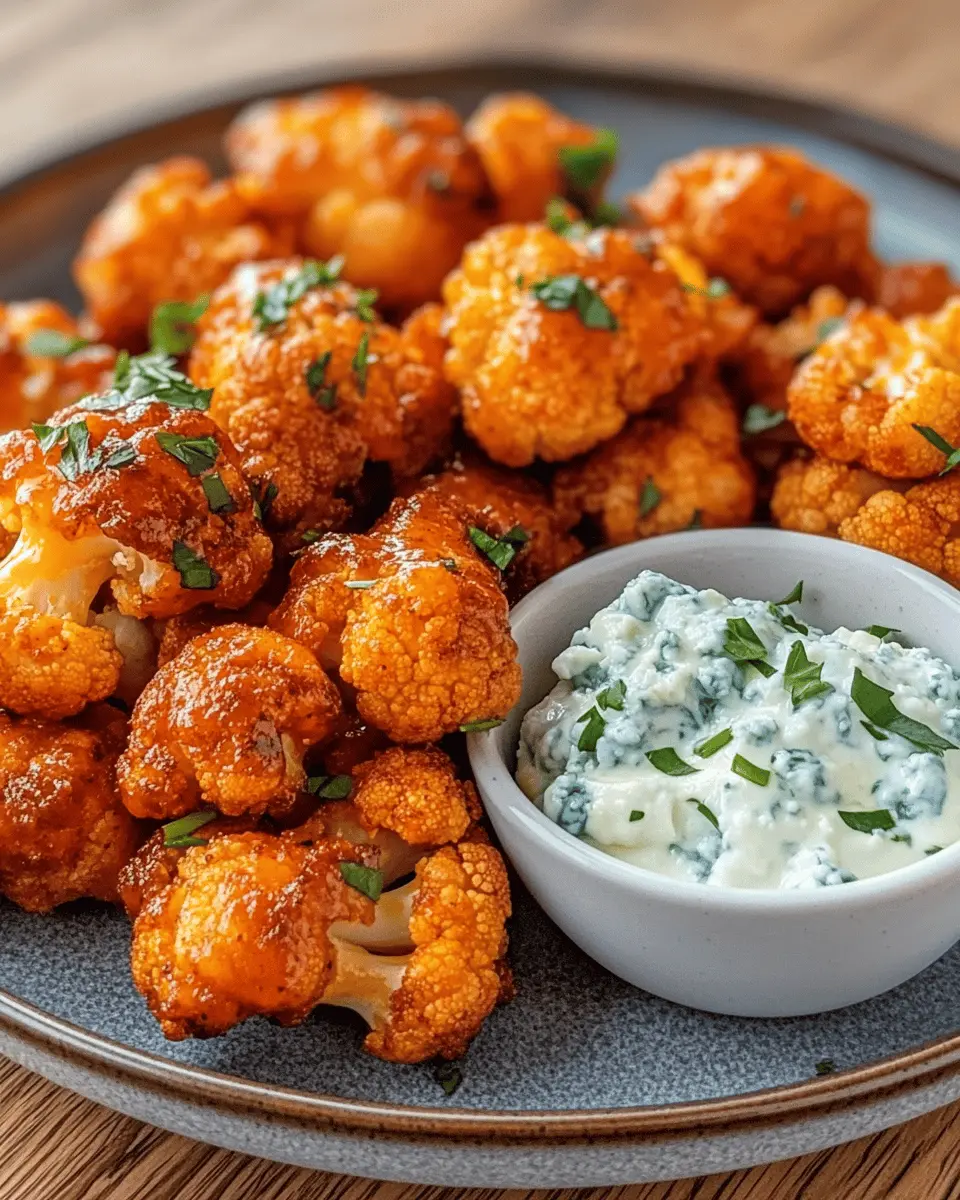 A delicious keto-friendly appetizer featuring crispy buffalo cauliflower bites served with a sugar-free blue cheese dip.
