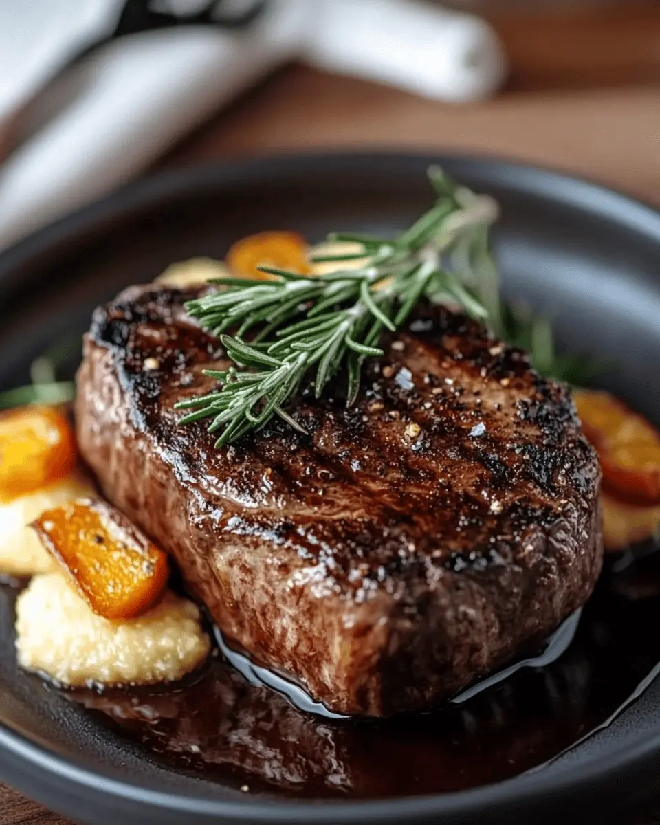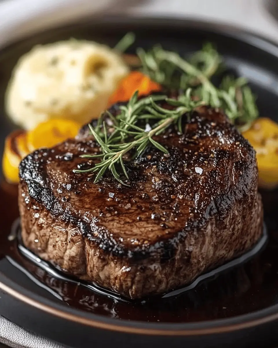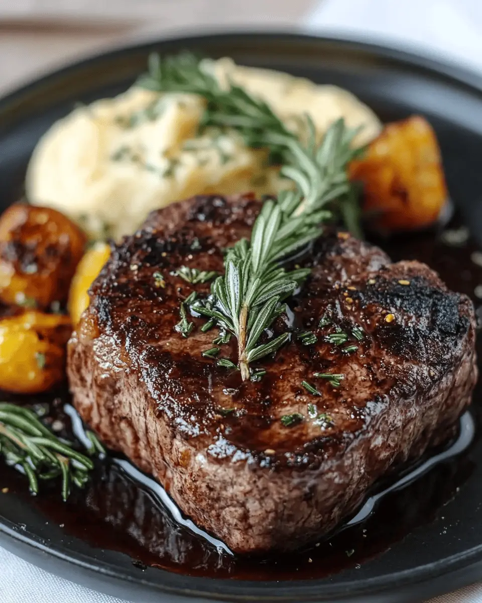 A luxurious steak dish featuring tender filet mignon, infused with the rich flavors of butter and fresh rosemary.