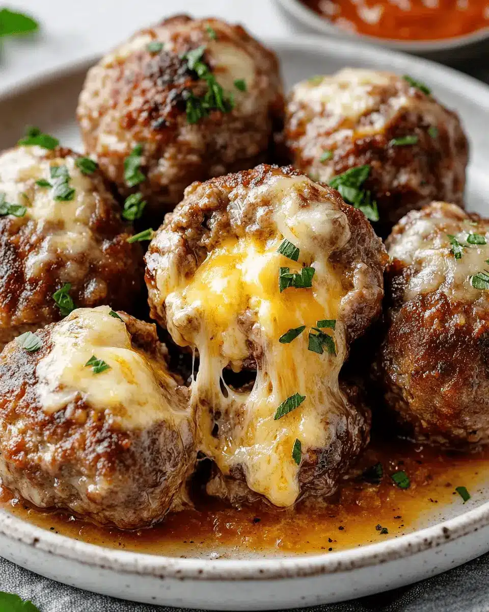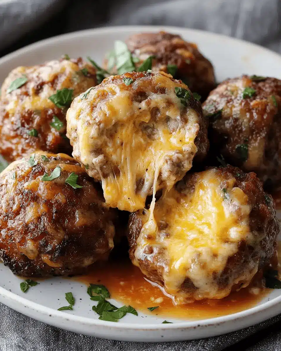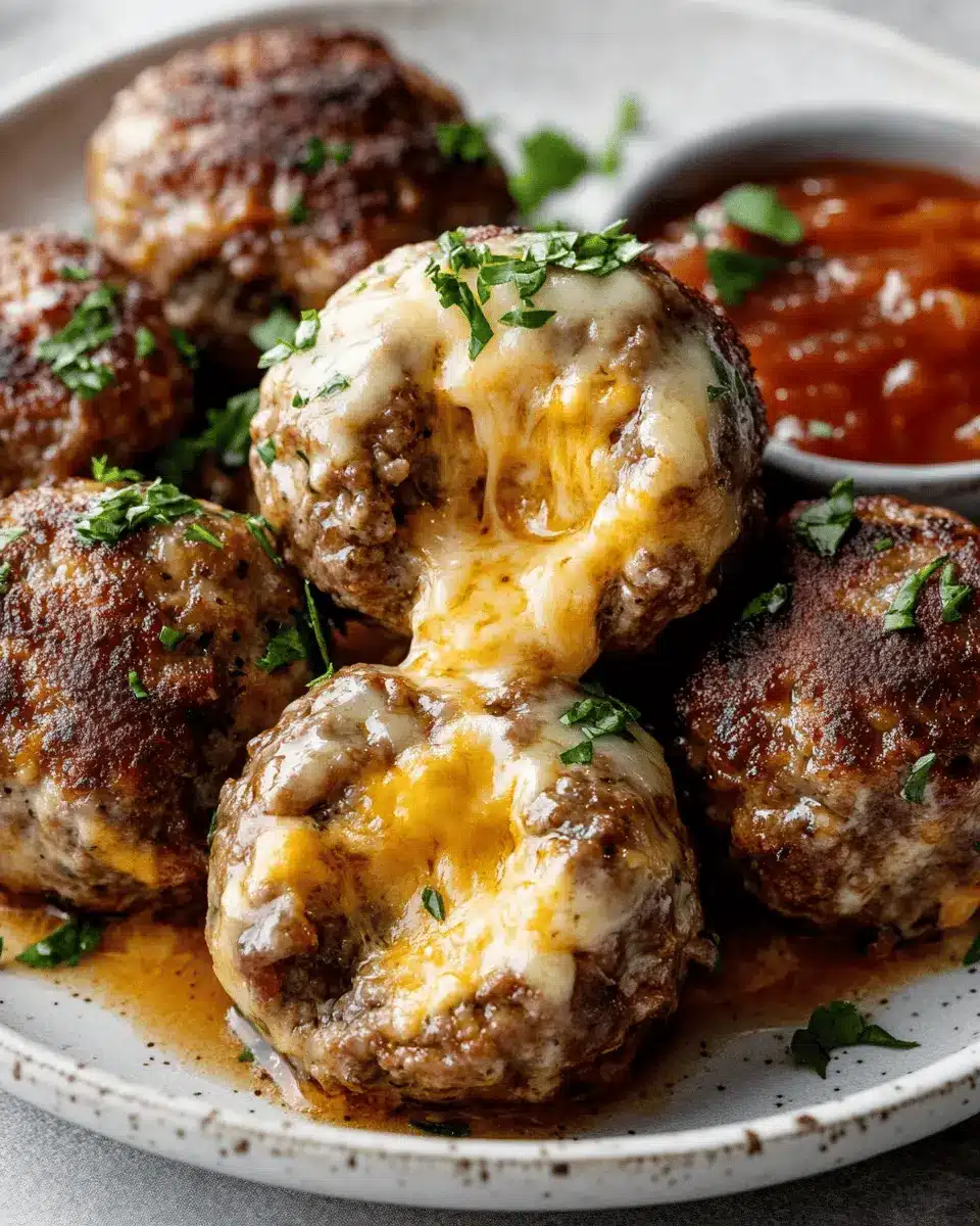 Delicious meatballs stuffed with melty cheddar cheese, perfect for a hearty meal.