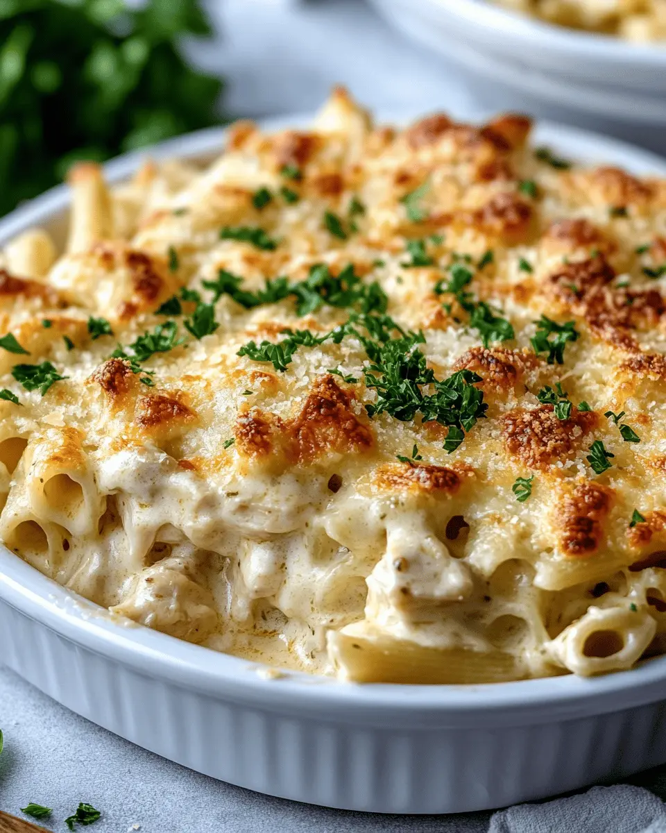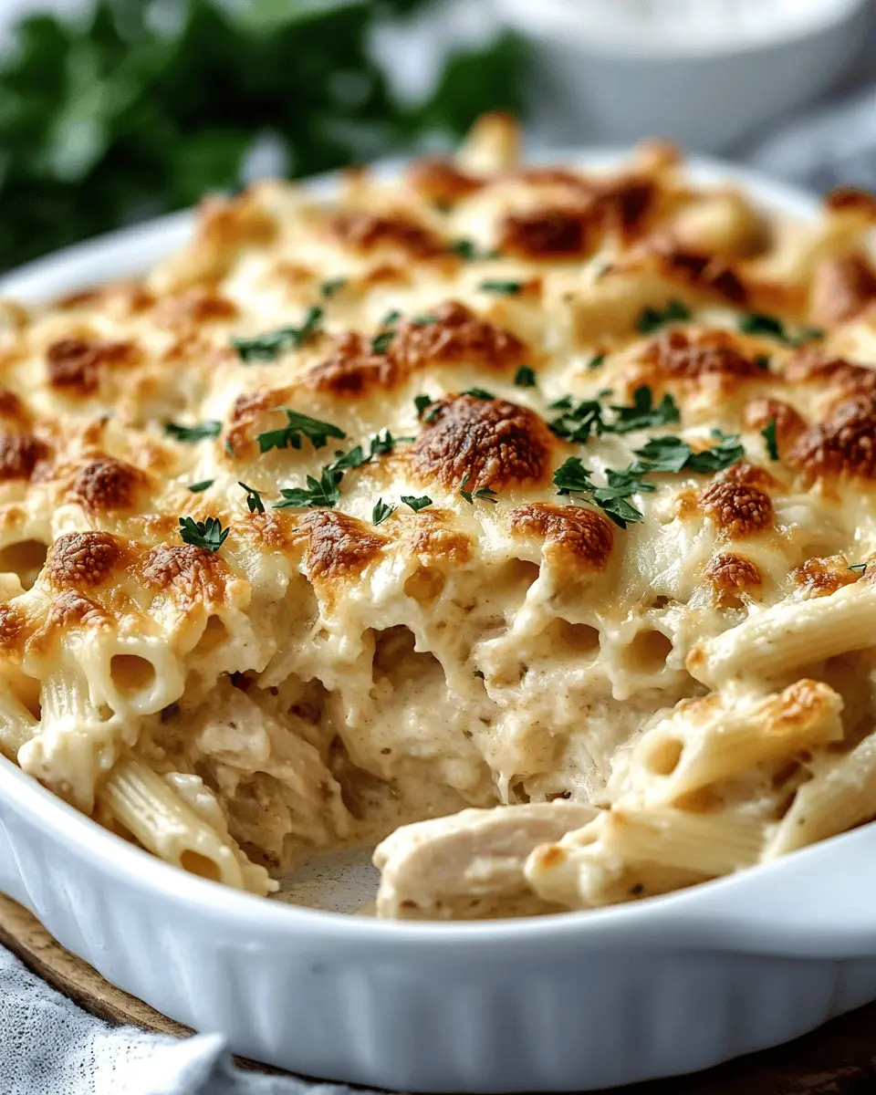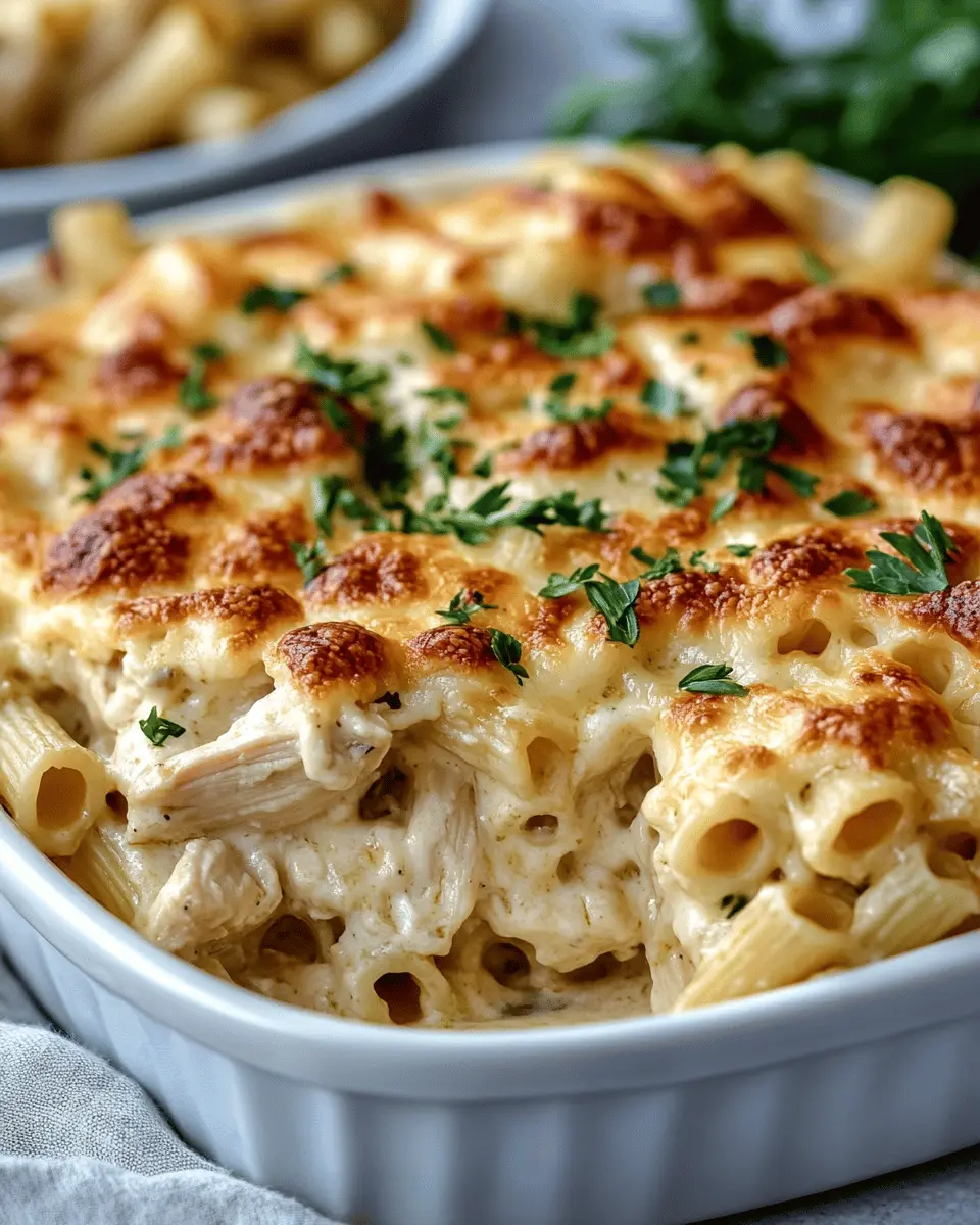 In summary, Chicken Alfredo Pasta Bake is a delightful and comforting dish that brings the family together. With its creamy texture and savory flavors, this recipe is perfect for busy weeknights and can be easily customized to suit your taste. Don’t hesitate to cook, save, or share this recipe to delight your loved ones!