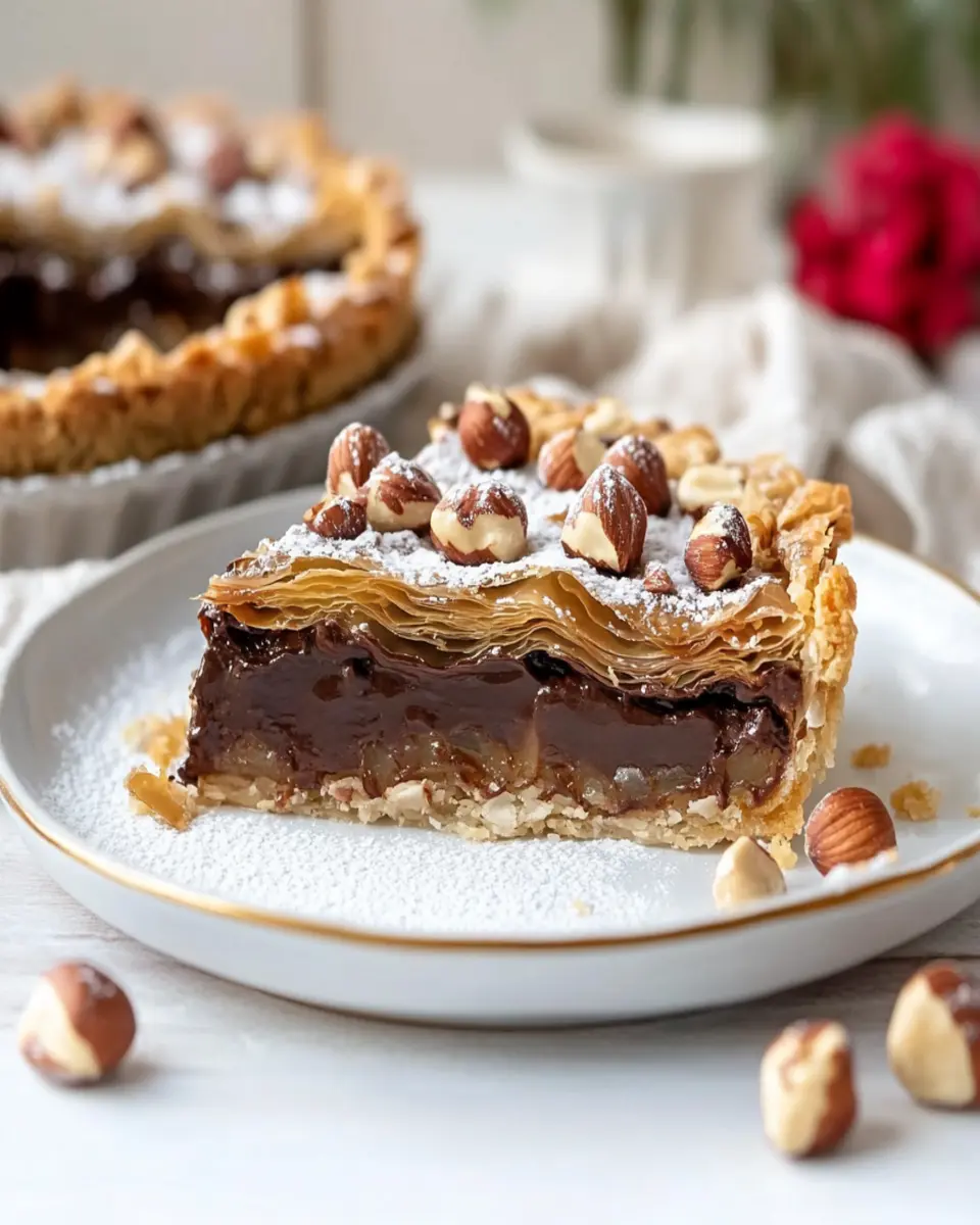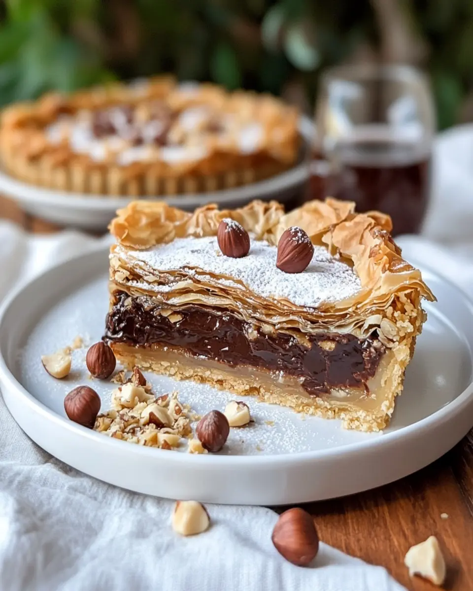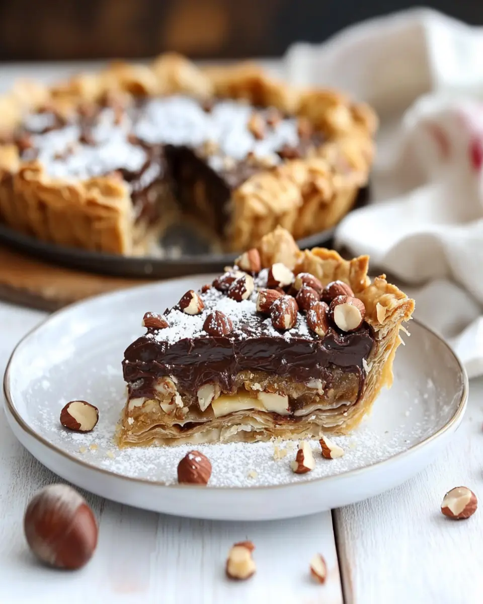 A rich and indulgent tart featuring layers of flaky pastry, chocolate, and hazelnuts.