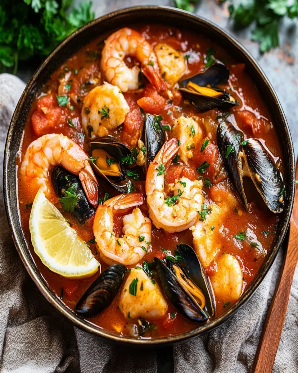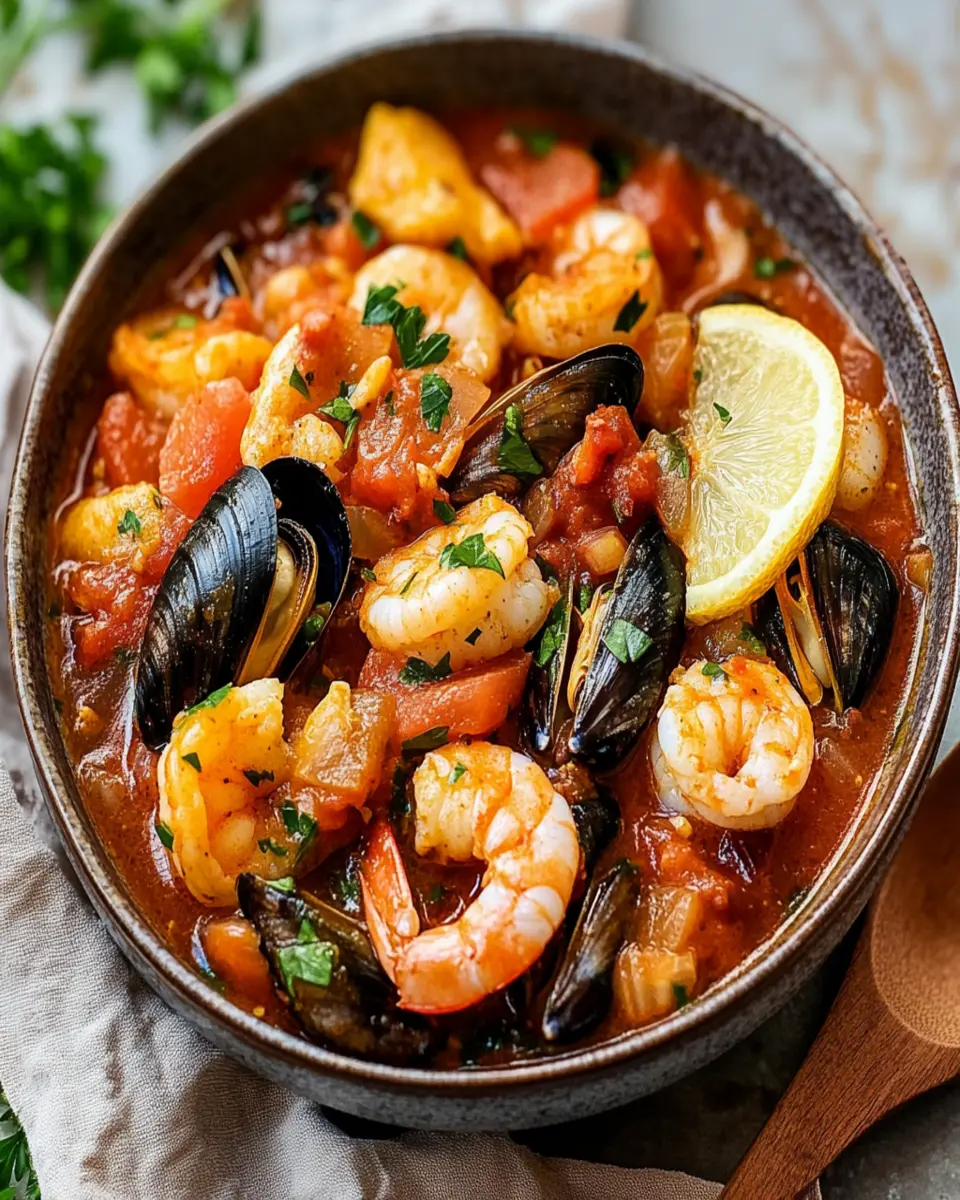 Cioppino is a flavorful Italian-American seafood stew originating from San Francisco, packed with a variety of fish and shellfish.