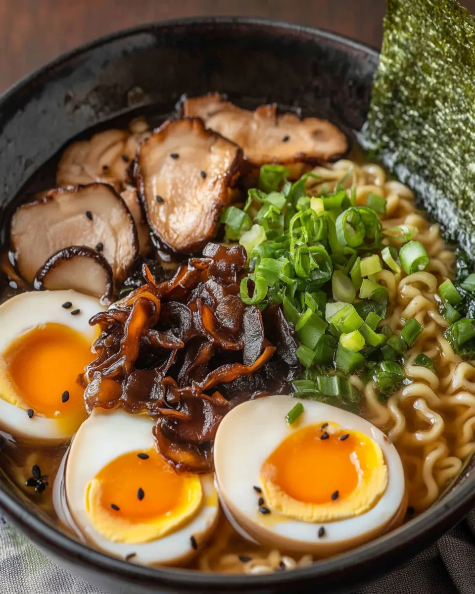 5. Serve the ramen in bowls, topped with crispy ear mushrooms, sliced green onions, and a soft-boiled egg.