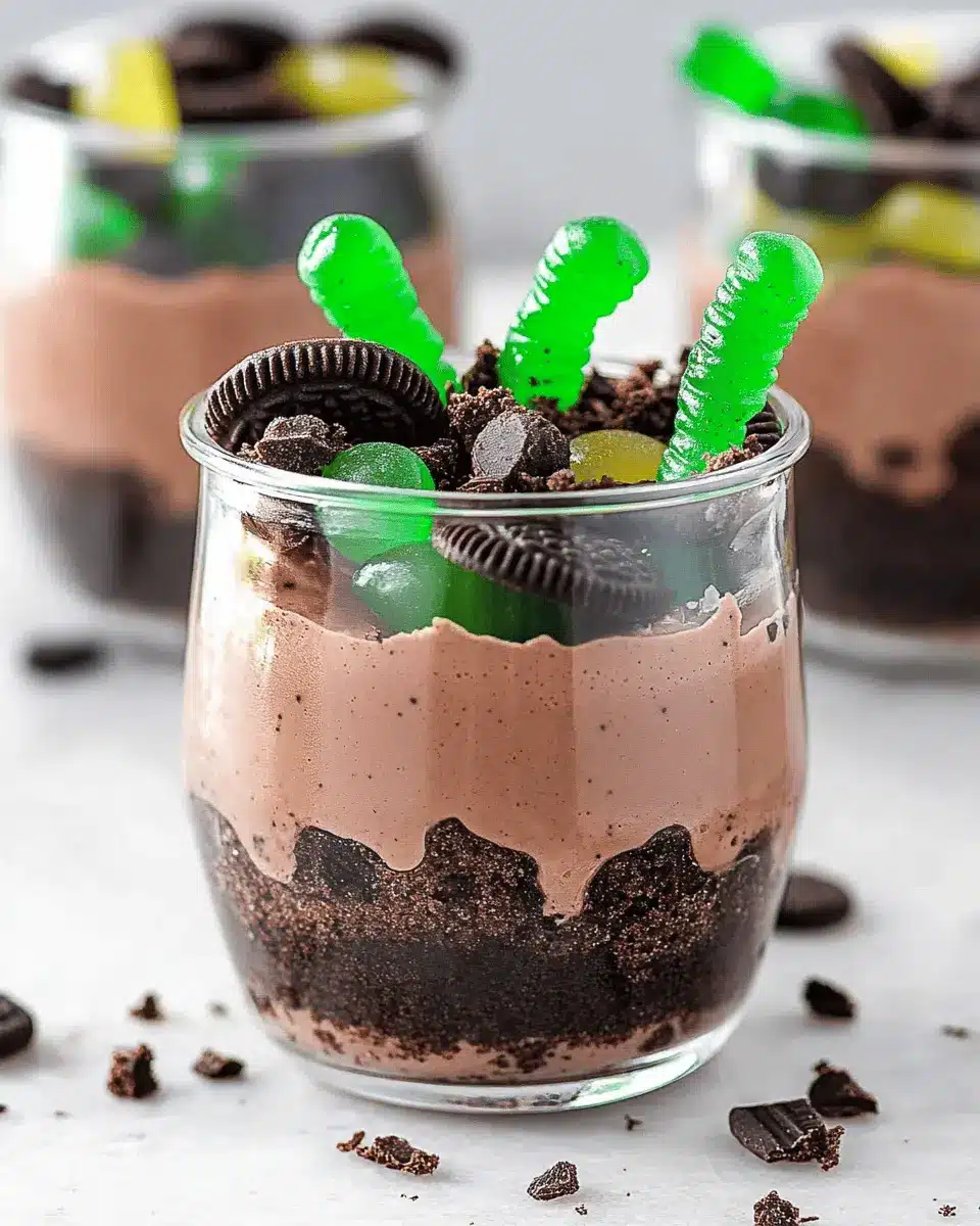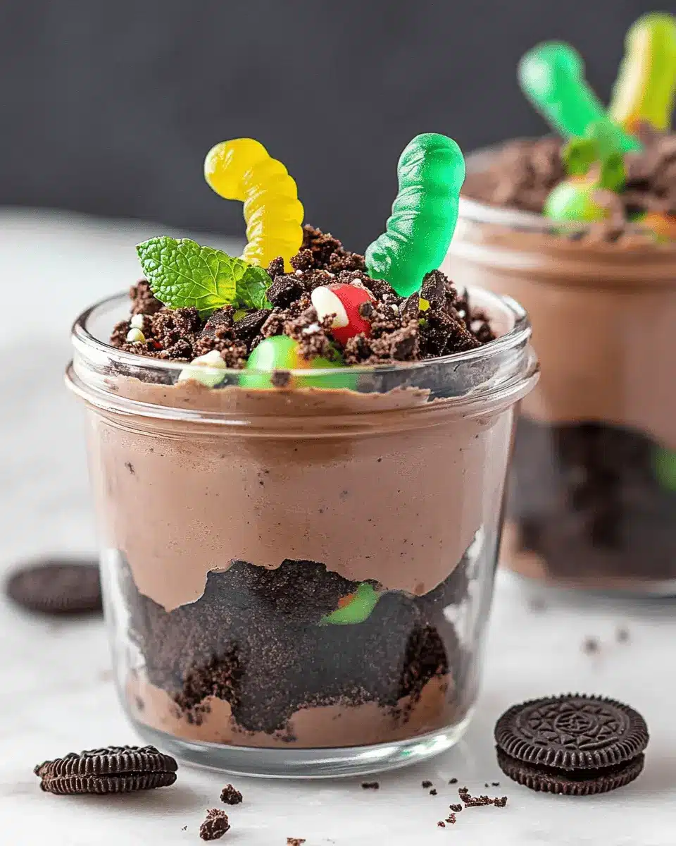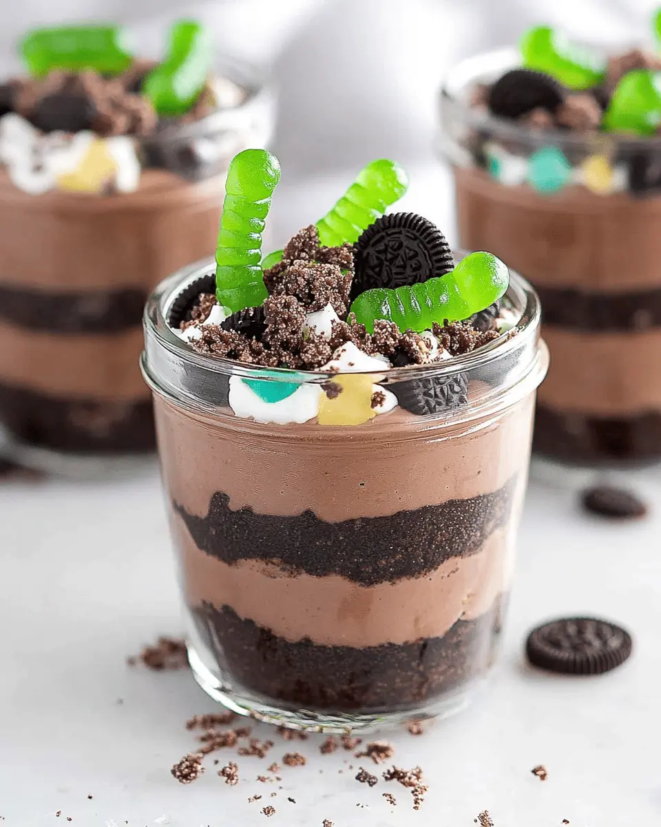 The gummy worms are not just for decoration; they add a fun, playful element to the dish that appeals to both kids and adults. These colorful candies make each serving visually appealing and enhance the overall experience of this delightful dessert.