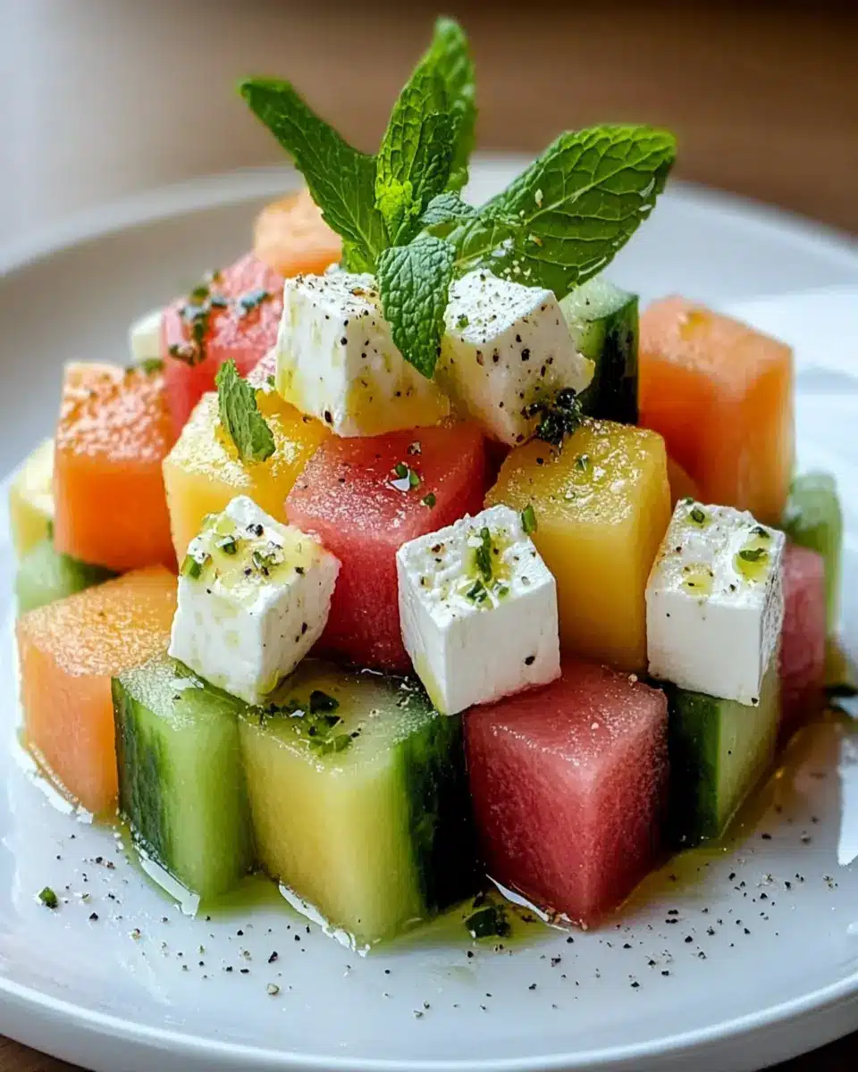 A refreshing and colorful salad that combines the sweetness of fresh melons with the saltiness of feta cheese, perfect for summer gatherings.