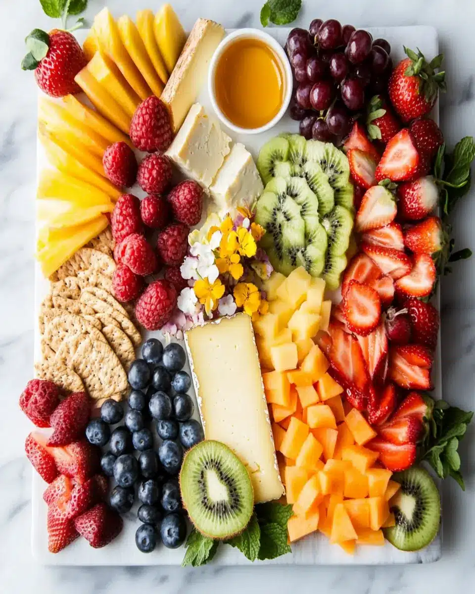 Not only does the Fruit and Cheese Platter look stunning, but it also tantalizes the taste buds with a delightful balance of sweet and savory flavors. The juicy fruits, creamy cheeses, and crunchy nuts harmonize beautifully, creating a sensory experience that’s sure to impress your guests. Plus, drizzling honey over the top adds a touch of elegance and sweetness that ties everything together.