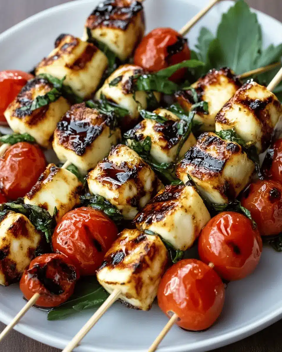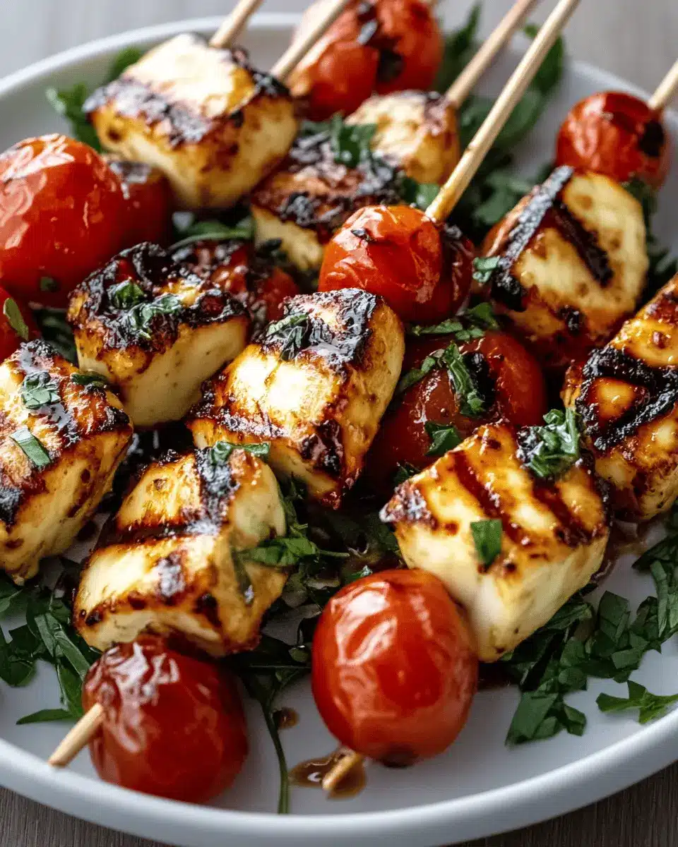 Grilled Halloumi & Cherry Tomato Skewers are incredibly versatile and can be enjoyed in various ways. One delightful serving suggestion is to pair them with a fresh arugula salad drizzled with a light lemon vinaigrette. The peppery arugula complements the rich flavors of the halloumi and the sweetness of the tomatoes, creating a harmonious dish.