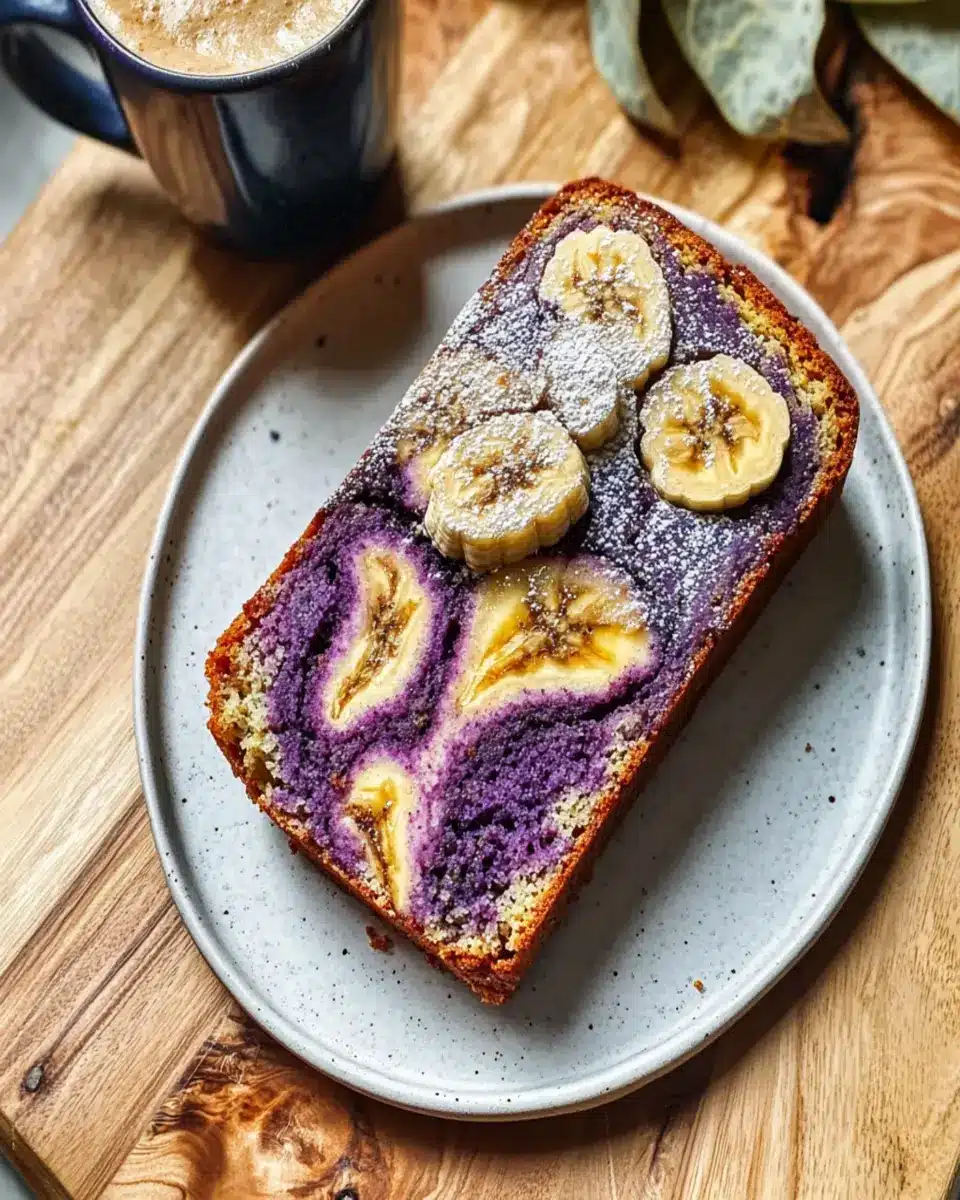 A delicious twist on classic banana bread with the unique flavor and vibrant color of ube.