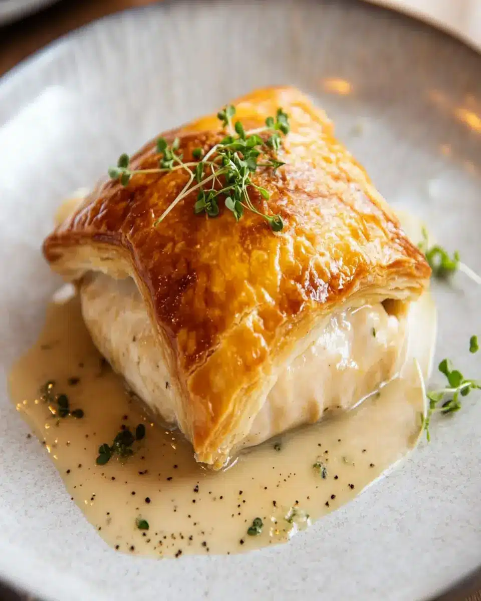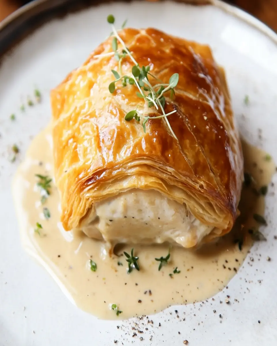 A delicious and elegant dish featuring tender chicken wrapped in flaky pastry with a rich Dijon cream sauce.