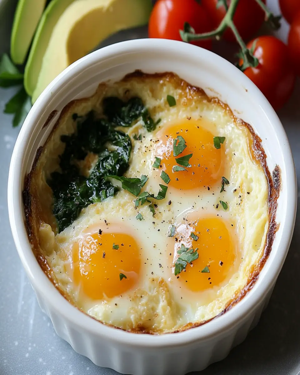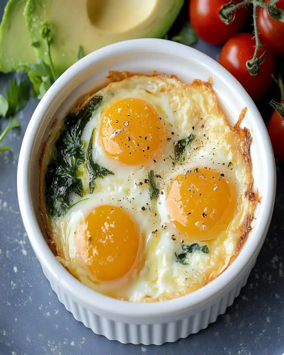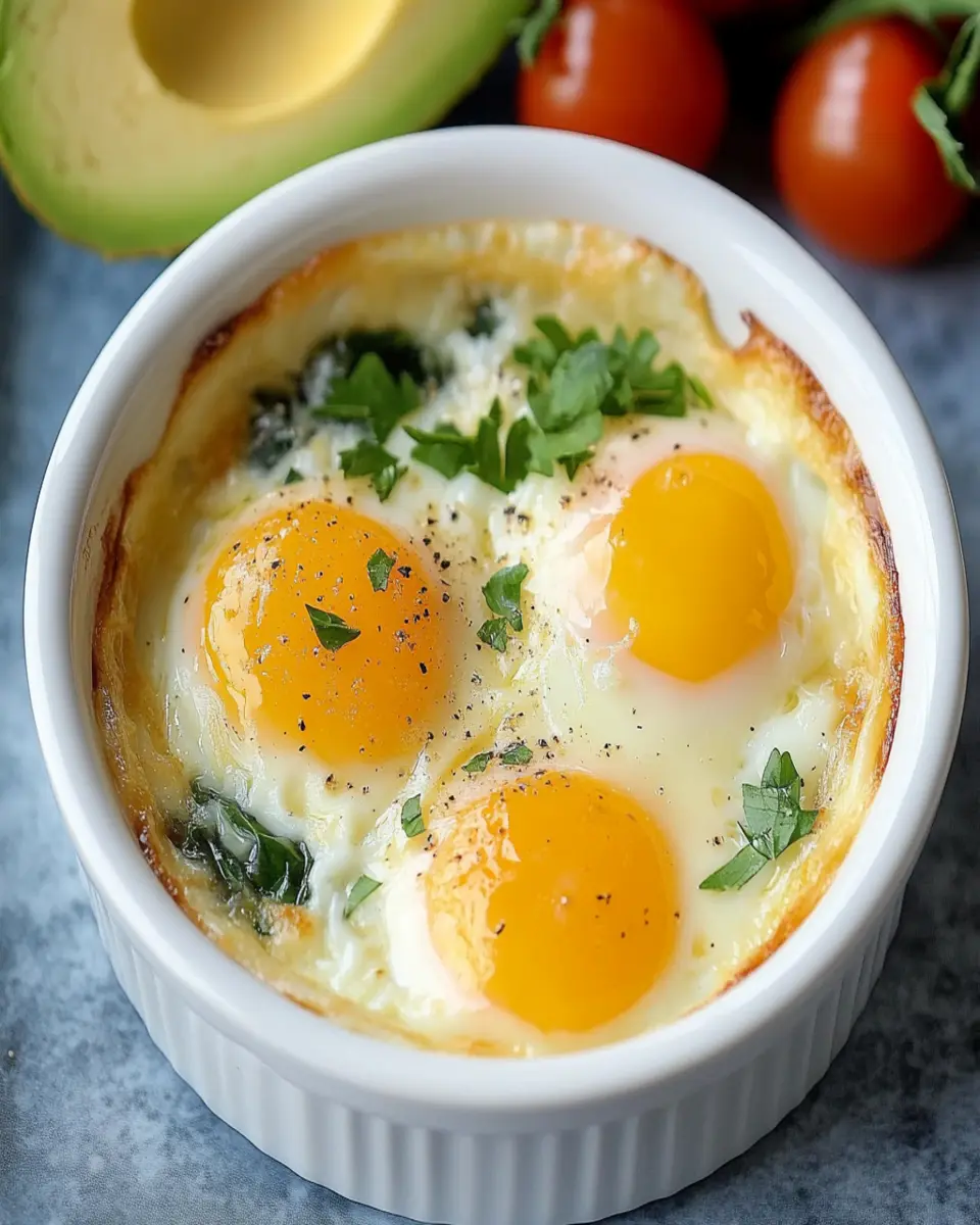 A delicious low-carb breakfast option featuring eggs baked in a creamy mixture.