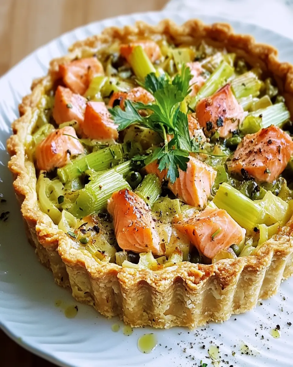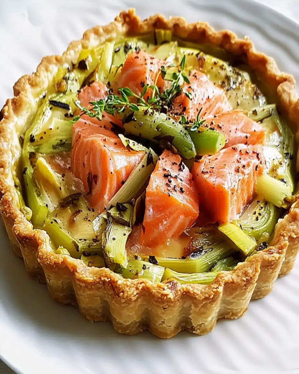 A savory tart made with delicate leeks and rich salmon, perfect for a lunch or light dinner.