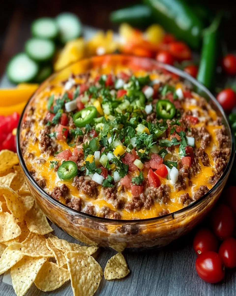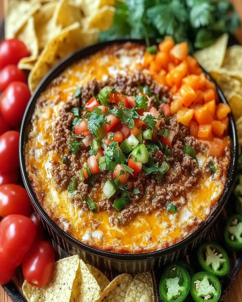 A rich and hearty dip that combines ground beef, cream cheese, and a variety of flavorful toppings, perfect for any gathering.