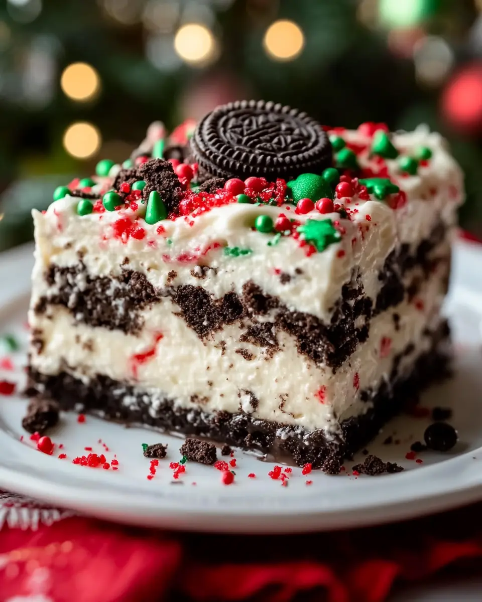 A festive and delicious no-bake dessert layered with Oreo cookies, cream cheese, and whipped cream.