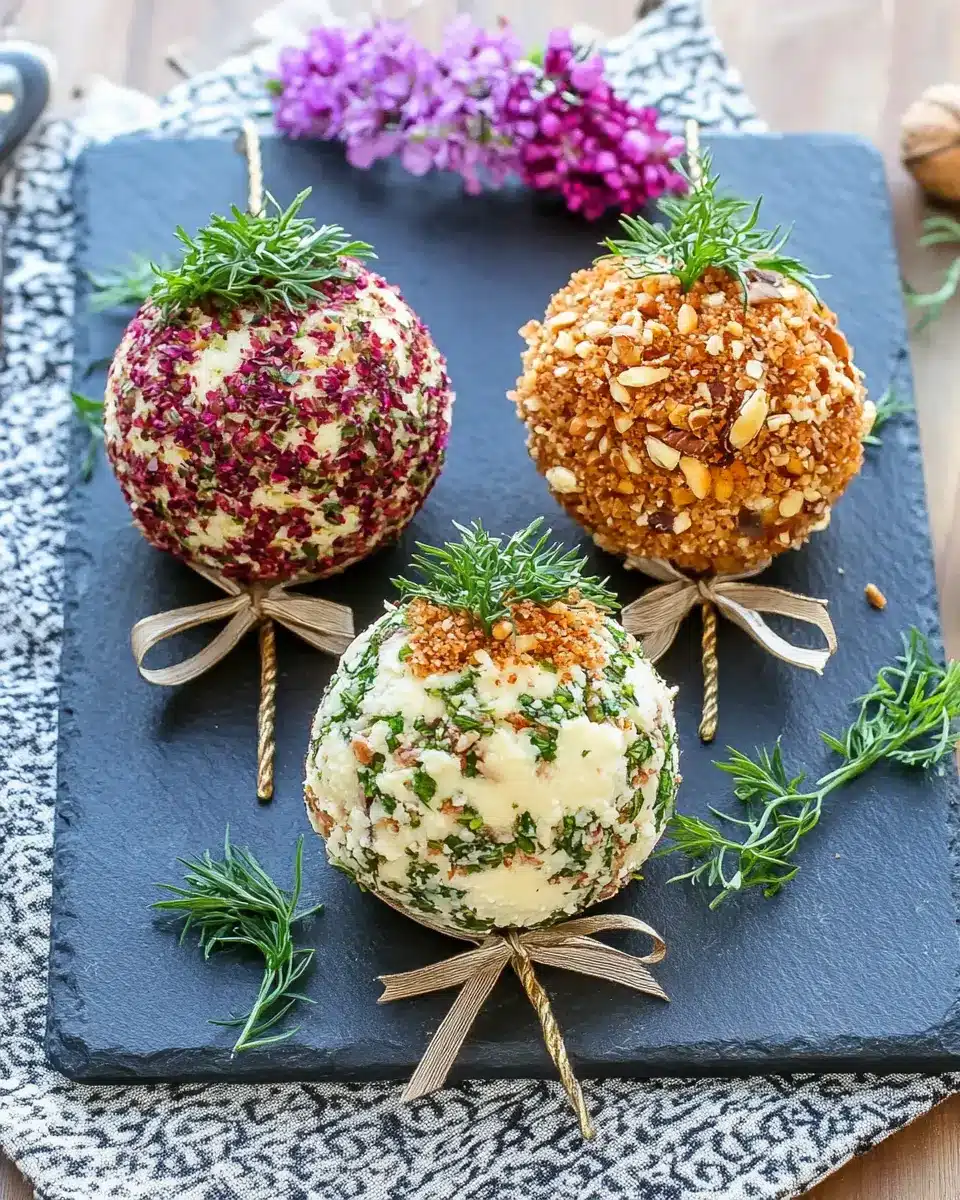 Delicious and festive cheese ball trio perfect for holiday gatherings.