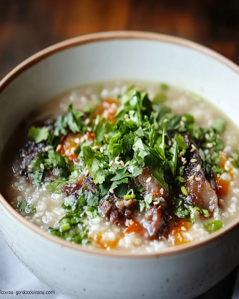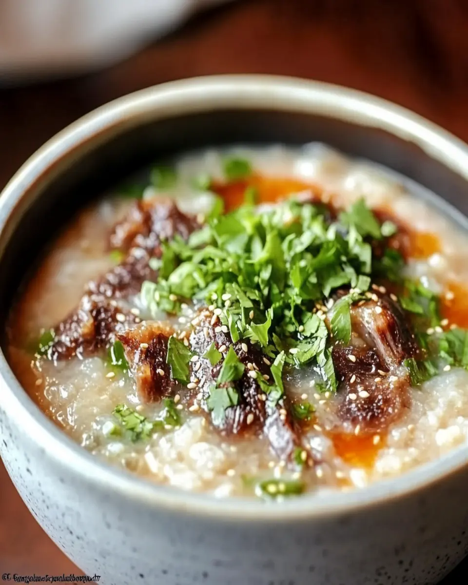 Garnishing your oxtail congee can elevate its presentation and flavor. Consider adding fresh cilantro or additional green onions for a burst of color and freshness. Serving it with a side of pickled vegetables can also enhance the overall experience, providing a nice contrast to the rich congee.