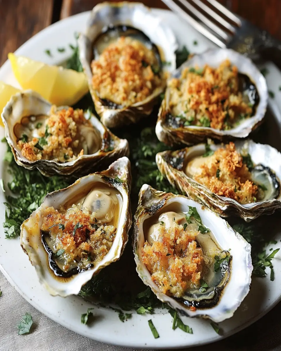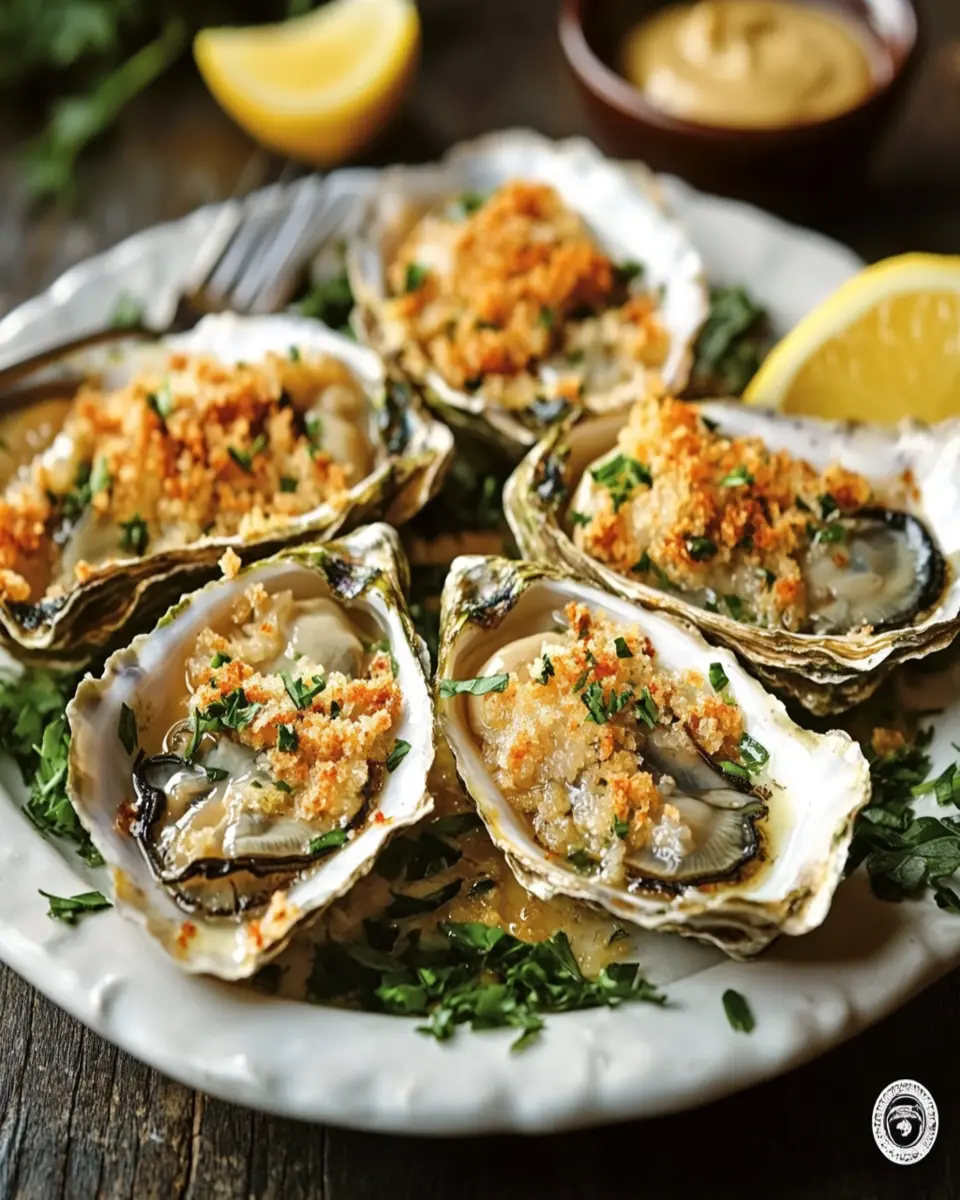 A classic recipe featuring oysters topped with a rich mixture of butter, herbs, and breadcrumbs, baked to perfection.