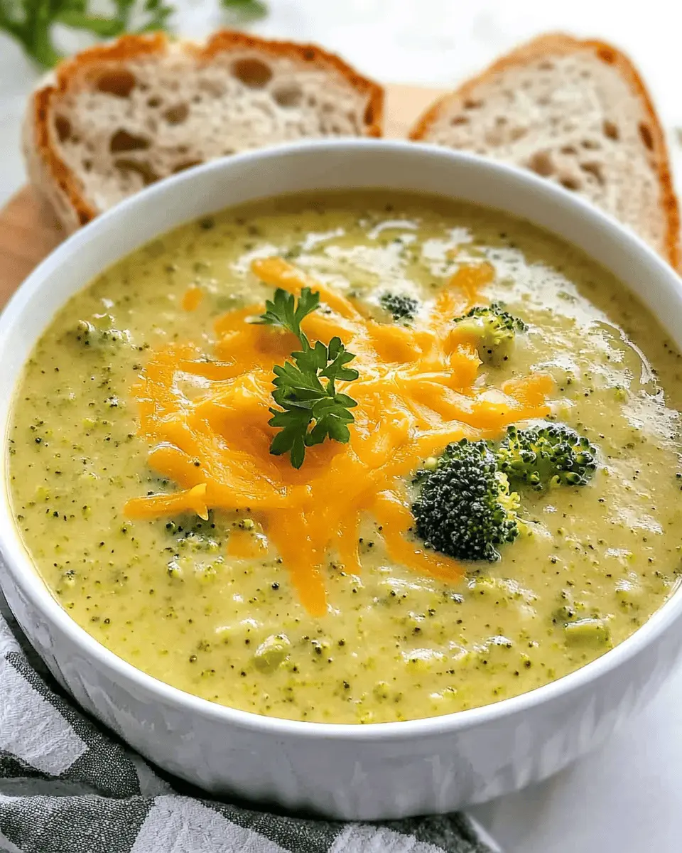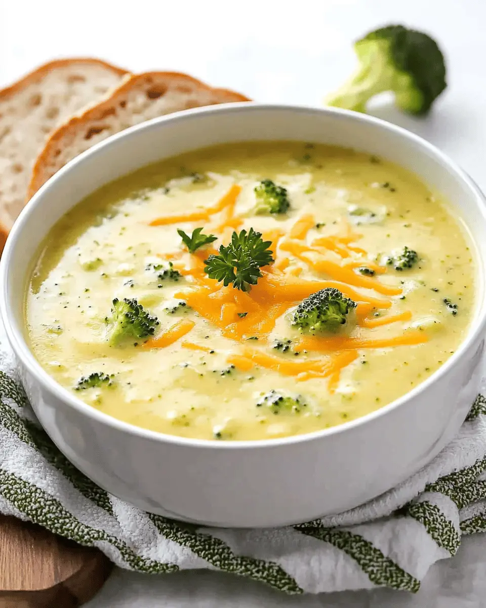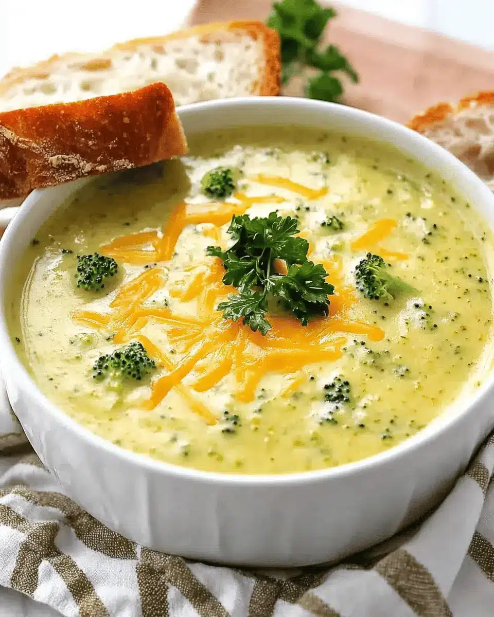 A creamy soup featuring fresh broccoli and cheddar cheese, inspired by Panera Bread’s famous recipe.