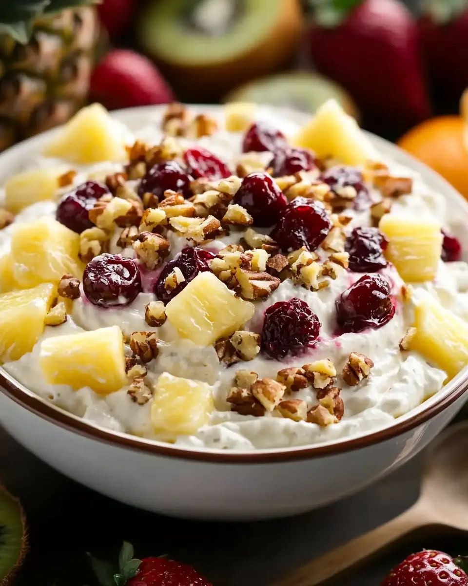 A delicious and creamy dessert dip made with pineapple and cranberry flavors, perfect for parties or a sweet treat.