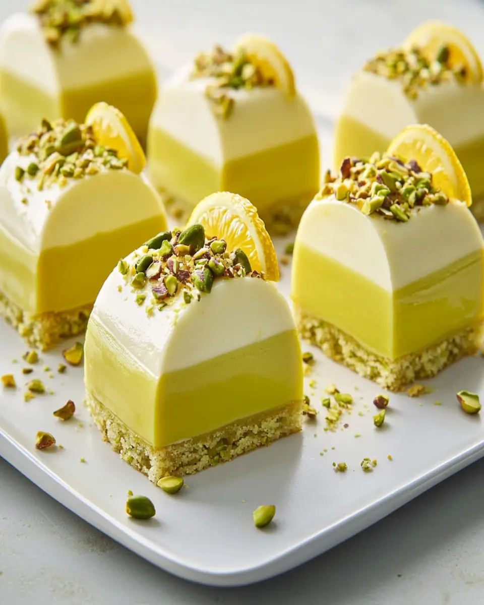 Delightful mousse cakes infused with the vibrant flavors of pistachio and Meyer lemon.