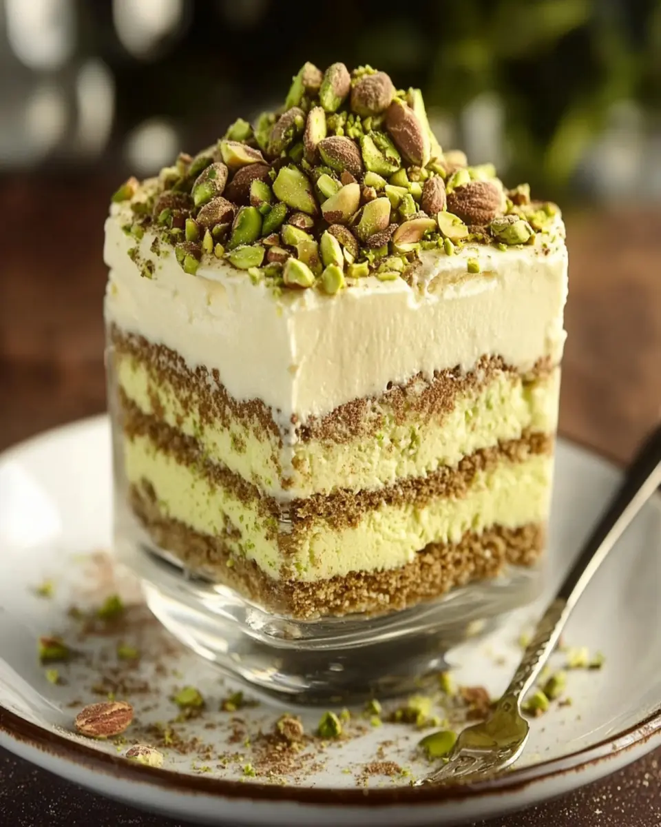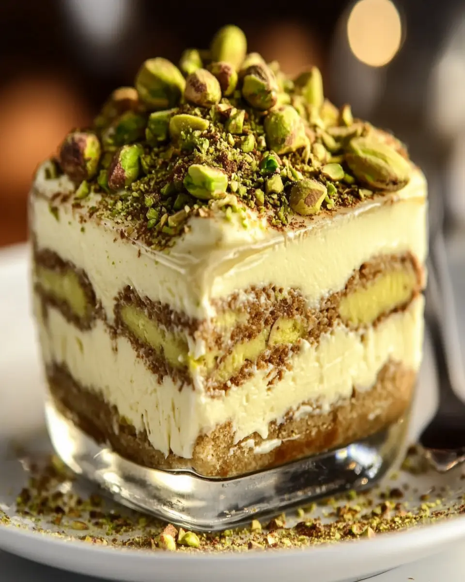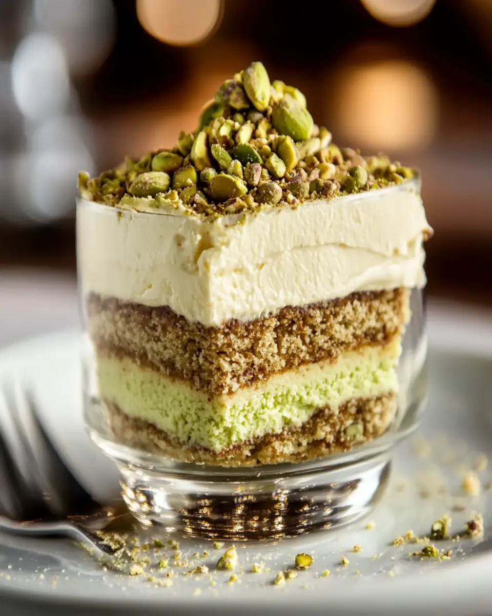 A creamy and nutty twist on the classic tiramisu, featuring layers of pistachio-flavored mascarpone and coffee-soaked ladyfingers.
