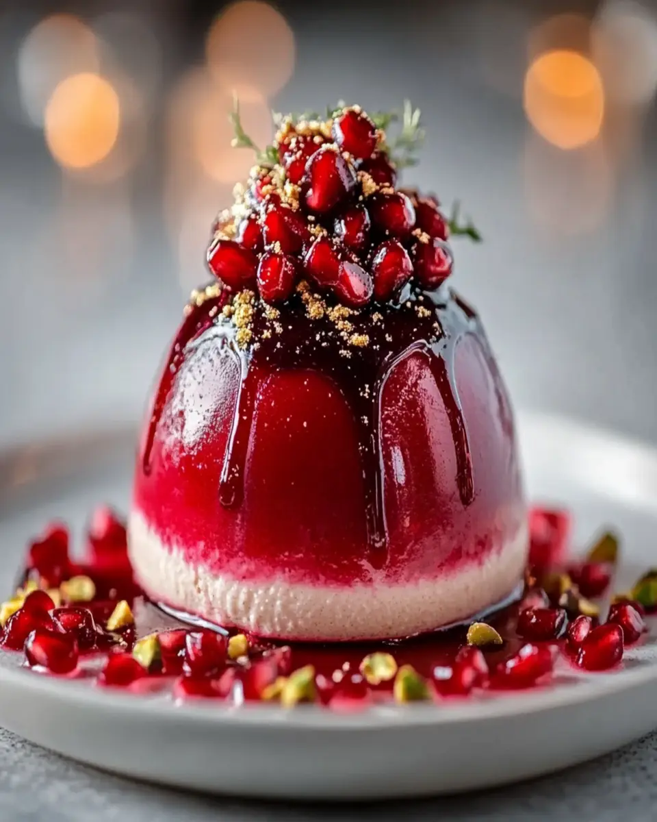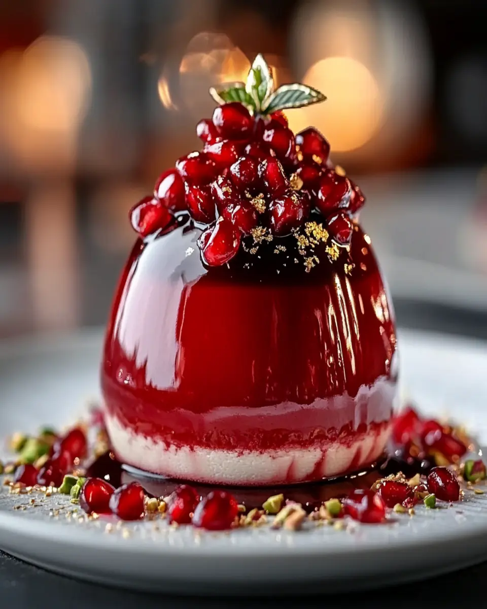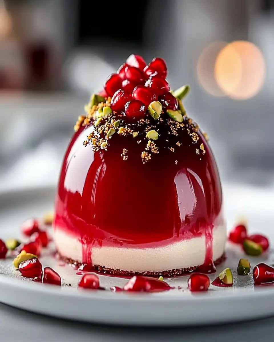 Imagine serving this stunning dome to your friends and family, where each bite reveals a luscious, creamy interior that harmonizes beautifully with the tart notes of pomegranate. It’s a dessert that embodies sophistication while remaining approachable for any home cook.