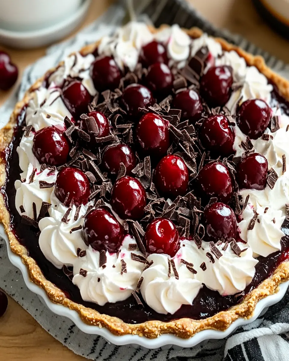 This decadent Black Forest Cherry Pie features a rich chocolate filling topped with a layer of whipped cream and tart cherries. Perfect for any special occasion!