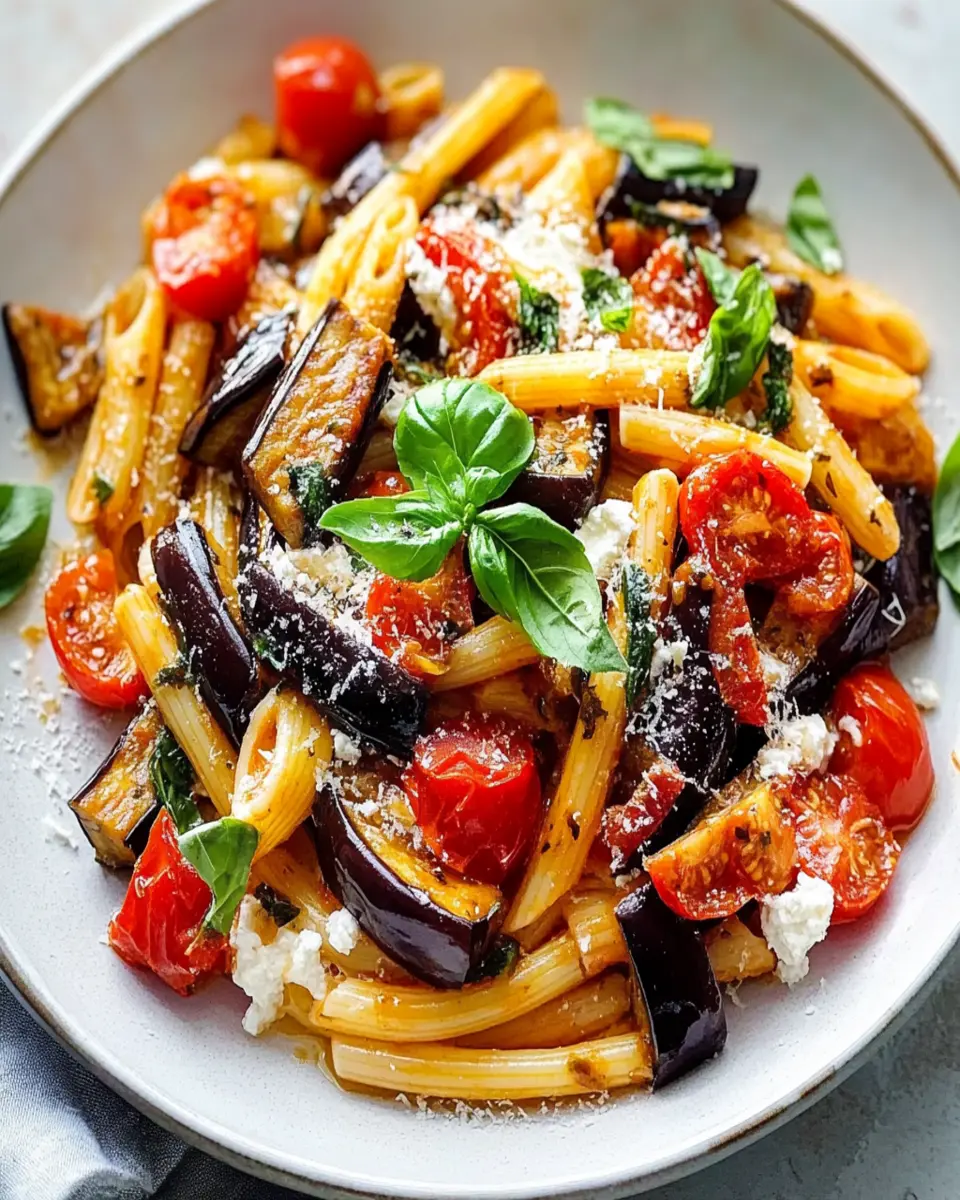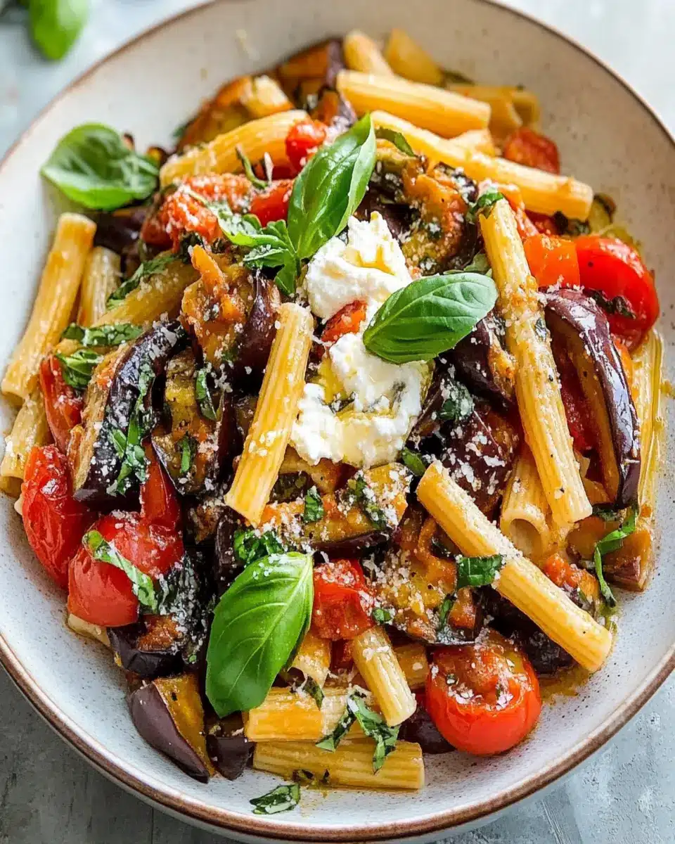 Sicilian pasta with eggplant, tomatoes, and ricotta is a vibrant Italian dish that combines tender pasta with sautéed eggplant, sweet cherry tomatoes, and creamy ricotta cheese. It’s a vegetarian-friendly meal that highlights the fresh flavors of its ingredients, making it both satisfying and nutritious.