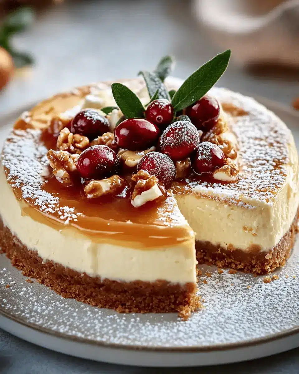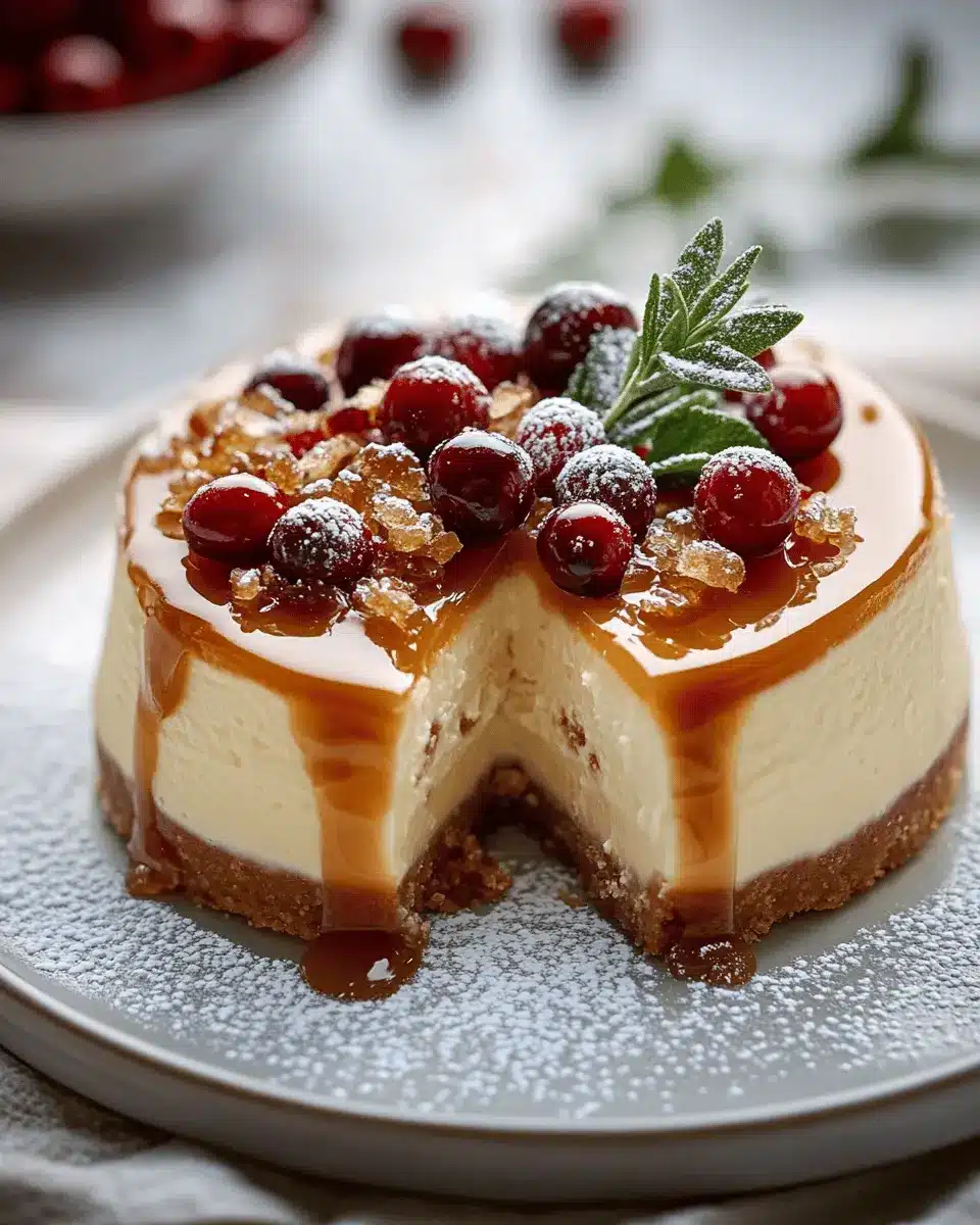 A rich and creamy cheesecake topped with a luscious caramel sauce, perfect for the holiday season.