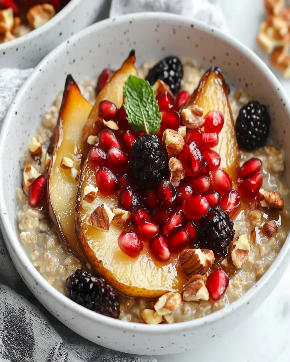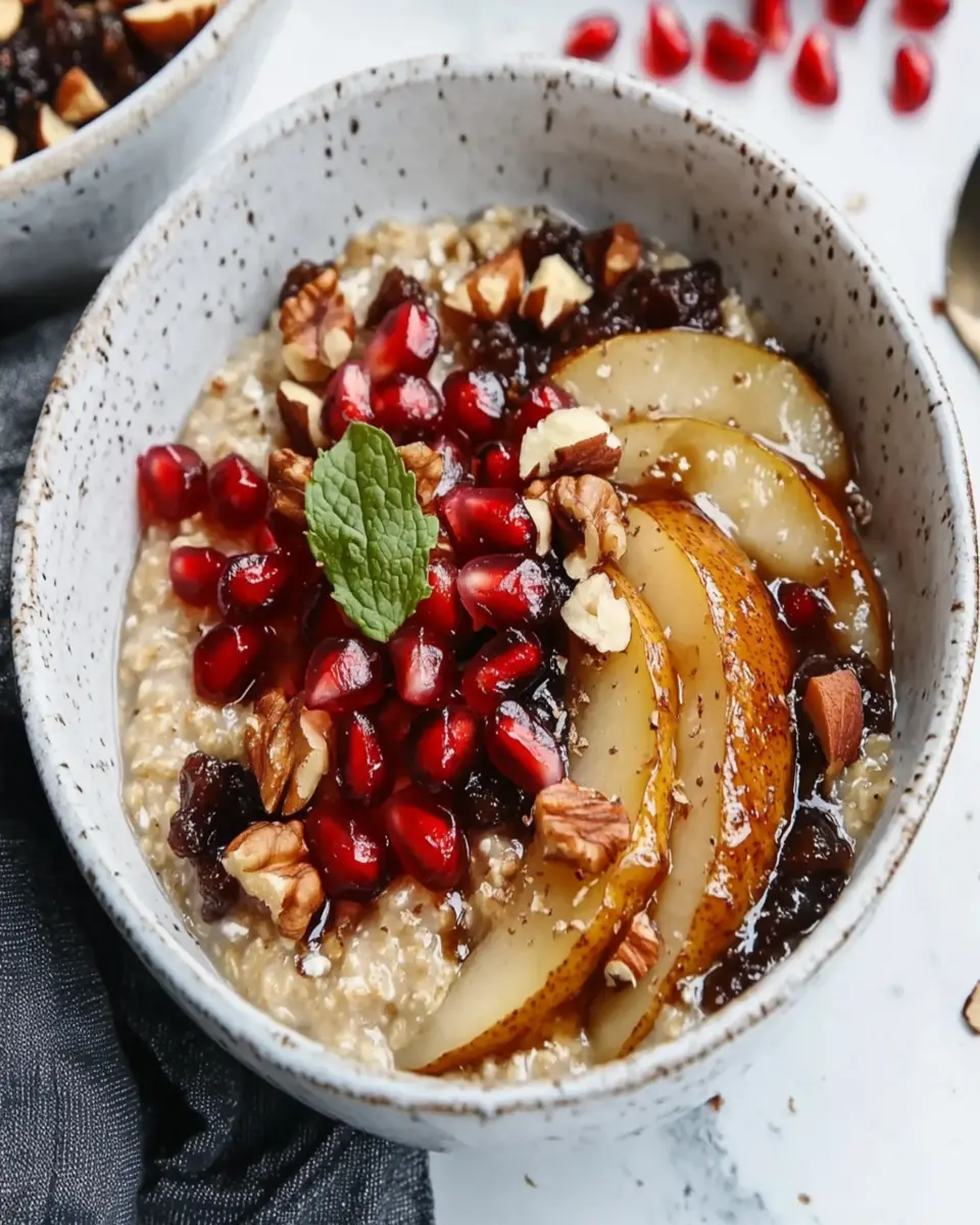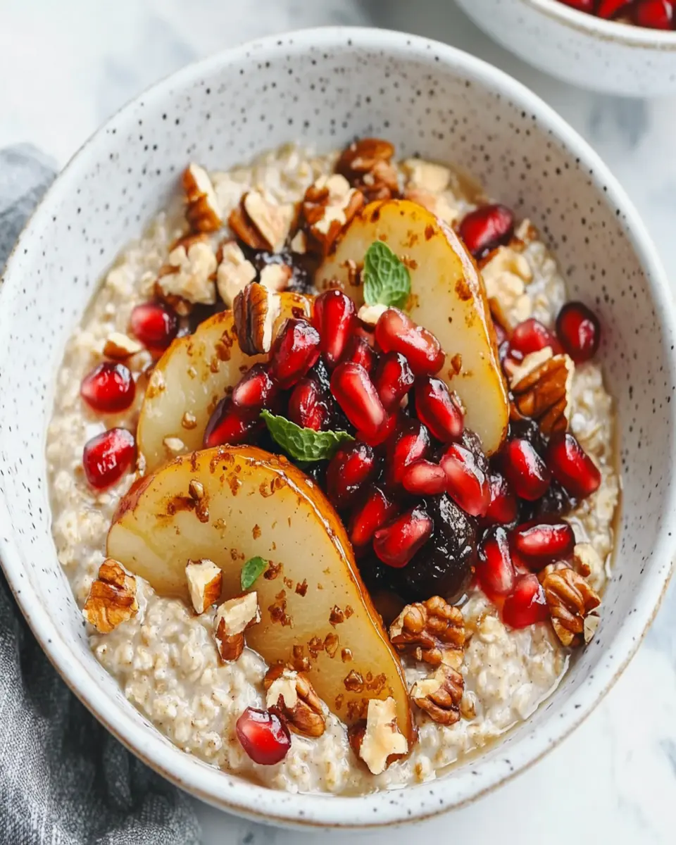 Ripe pears bring natural sweetness and a juicy texture to the dish. When roasted, they caramelize beautifully, enhancing their flavor and adding a luxurious touch to the oatmeal.