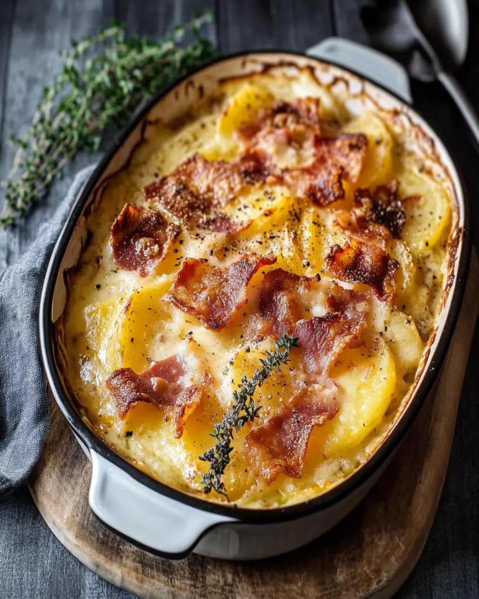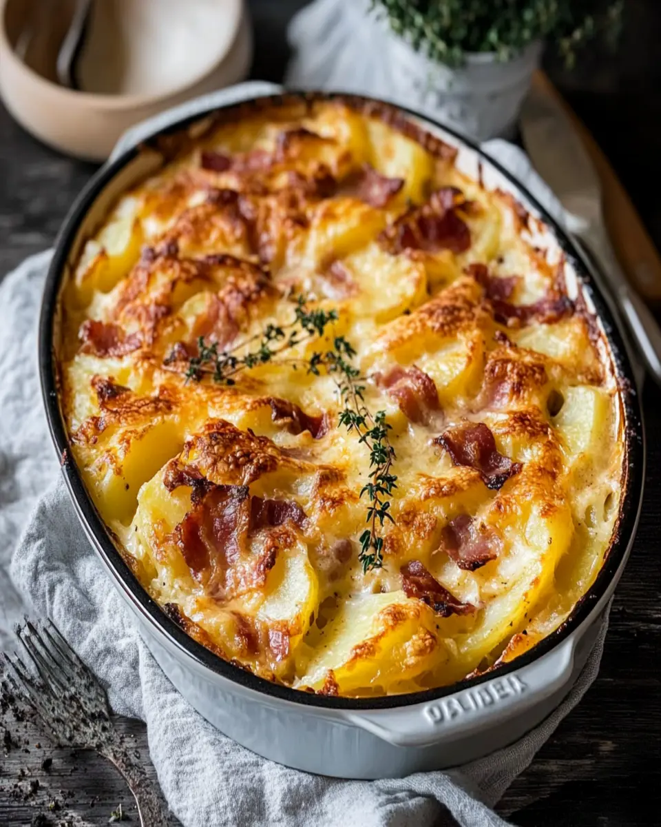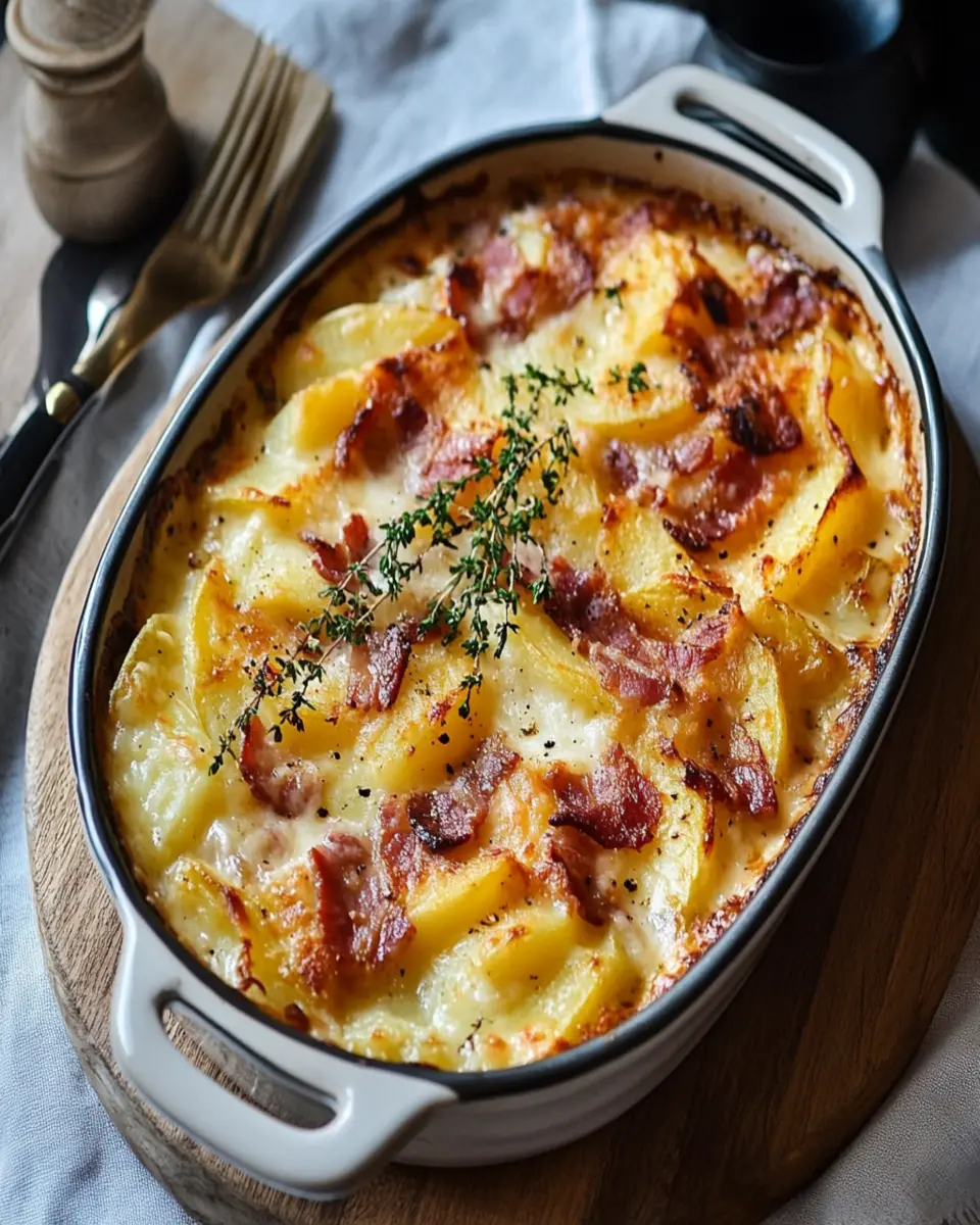 A creamy and rich French casserole made with potatoes, bacon, and reblochon cheese.
