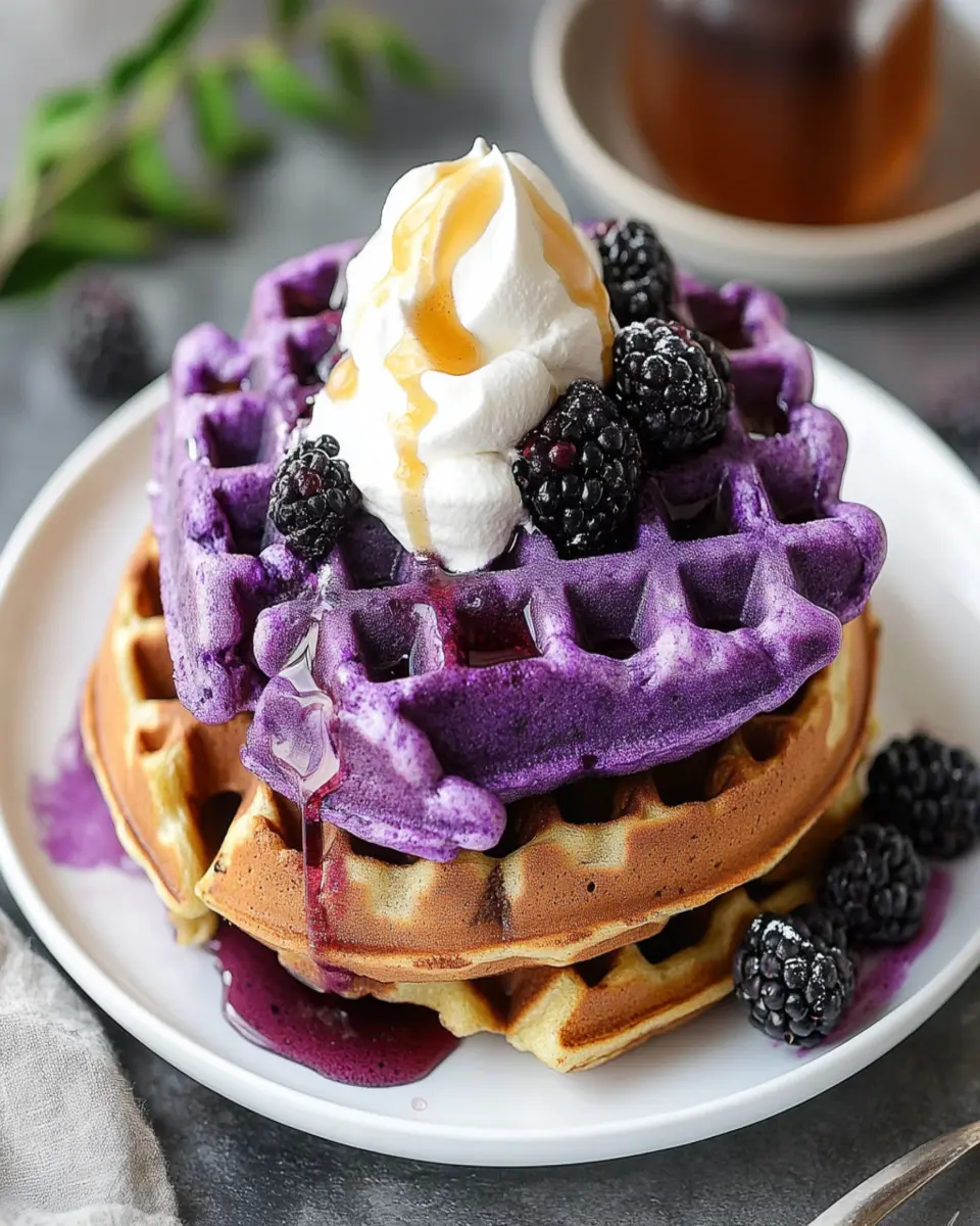 The Ultimate Crispy Ube Waffles are delicious on their own, but they truly shine with the right toppings. For a classic touch, serve them with a generous drizzle of maple syrup and a dollop of whipped cream. Fresh fruits such as strawberries, blueberries, or banana slices not only add flavor but also provide a refreshing contrast to the sweetness of the waffles.
