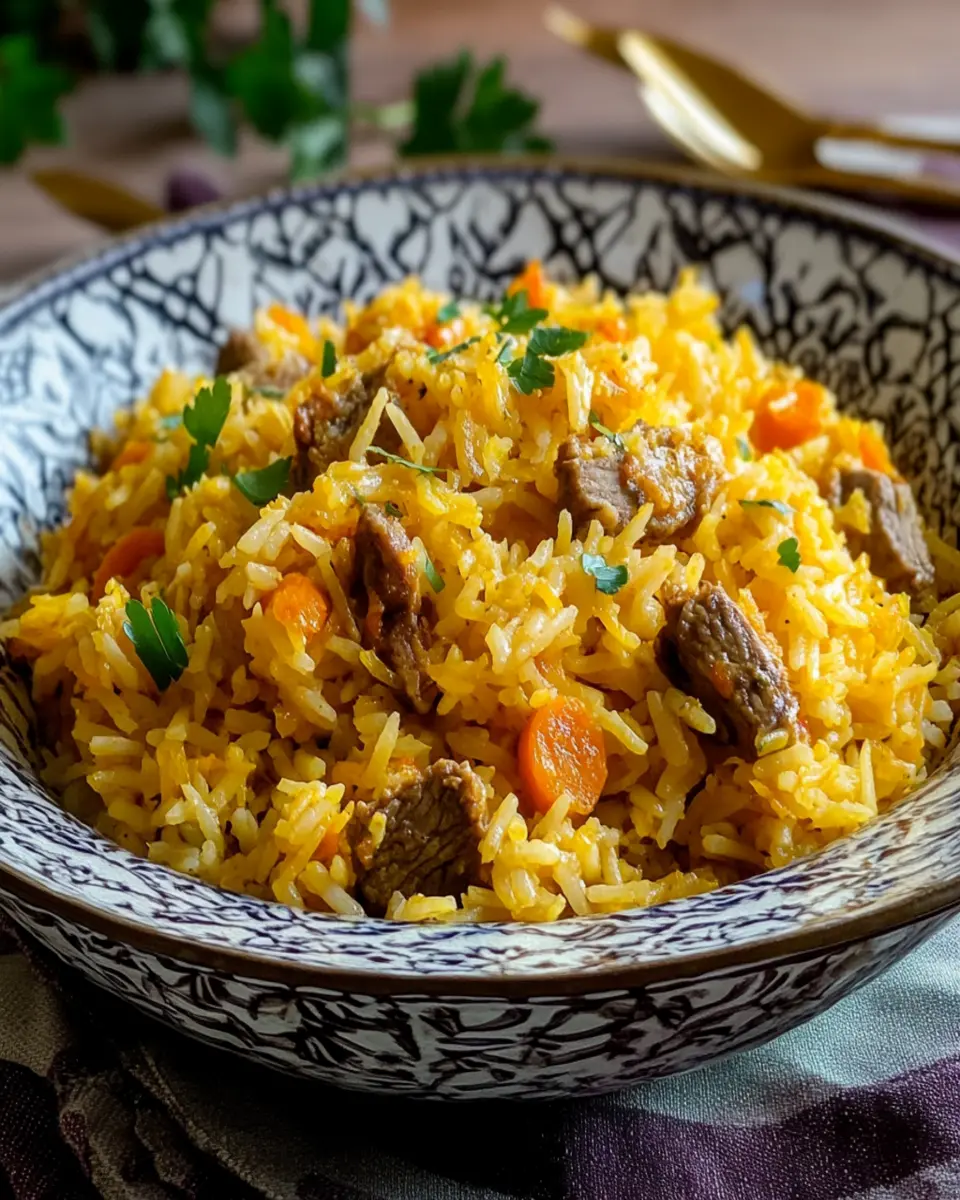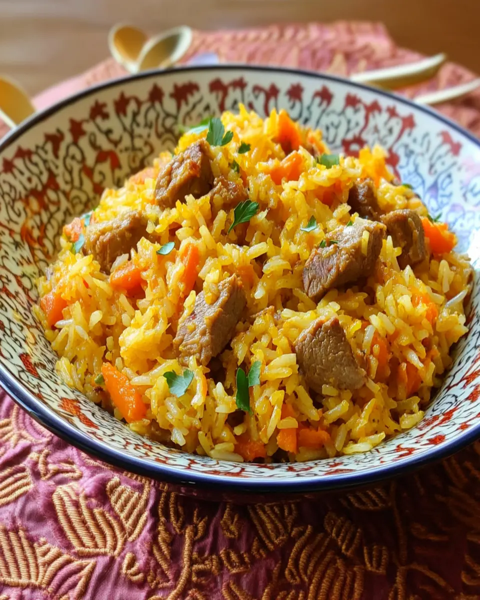 A hearty and flavorful pilaf made with tender lamb, vibrant carrots, and aromatic spices, representing the rich culinary tradition of Uzbekistan.