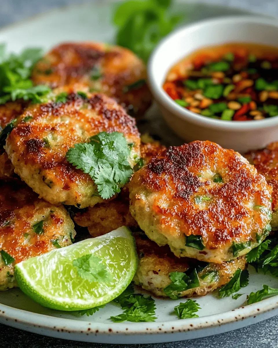 As the focus keyword suggests, the delightful combination of flavors is enhanced by the tangy Nuoc Cham dipping sauce, which adds a refreshing zing. Imagine biting into a golden, crispy fish cake that is perfectly complemented by the burst of flavor from cilantro, mint, and green onions. This dish not only excites your taste buds but also presents an appealing dish that is sure to impress at any gathering.