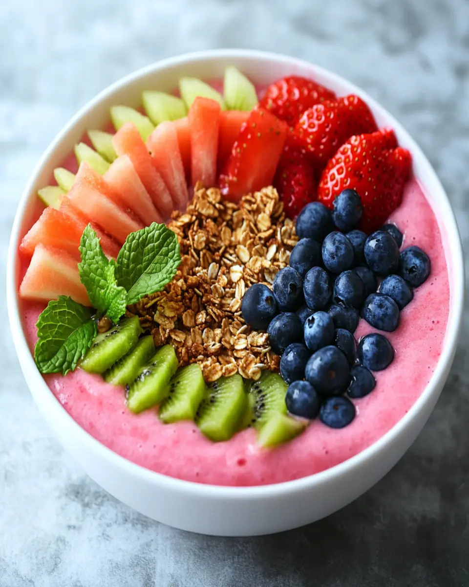 Whether you’re rushing out the door or taking a moment to relax, the Watermelon Smoothie Bowl fits seamlessly into any lifestyle. It’s a perfect meal prep option for busy young professionals who cherish homemade food but may lack time. Plus, with the freedom to customize toppings like granola, sliced almonds, and fresh mint, each bowl can be a personal expression of taste and creativity.